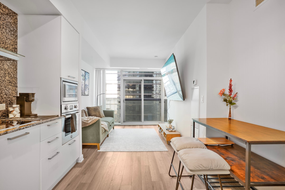Welcome to your perfect winter and summer getaway in the heart of Downtown Toronto! Enjoy beautiful CN Tower view from the living room. This modern 2BR offers warm indoor PATH access to Union Station, multiple retail shops, cafés, LCBO, restaurants and Scotiabank Arena, ideal for winter stays. Features include an 85" TV, fast Wi-Fi, full kitchen, in-suite laundry, in addition a building pool, sauna, jacuzzi, and gym.