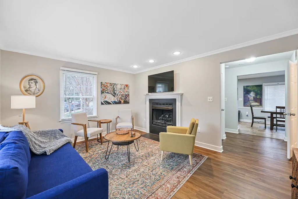 Steps to King St: Fire place + Room darkening curtains + Kitchen w/ all amenities! Whether you’re traveling for business or pleasure, you’ll be delighted to know you are staying in the Heart of Old Town Alexandria, VA. Merely steps to top attractions. Indulge in the city's best coffee & ice cream shops, visit local artists, unique small businesses, 5 ★ restaurants, & creatively curated bars. And then unwind in a custom designed modern luxury apt, stocked kitchen, an oceanic shower experience.