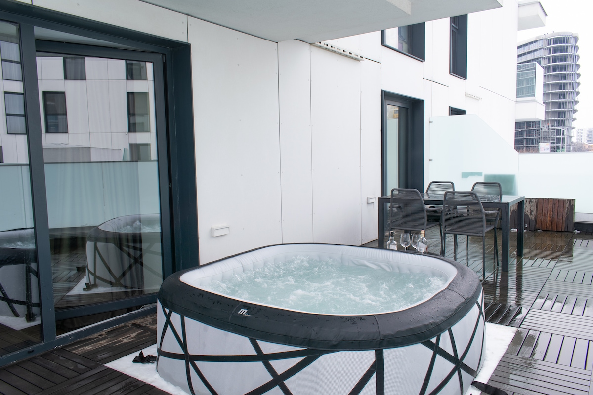 Enjoy a hot JACUZZI in this 1Bedroom 1Bathroom apartment, ideally situated in the north of Bucharest, just a couple of steps away from the Business Centre. It features everything you may desire during your visit. Besides the cozy indoors, it offers a private large terrace from which you can gaze at the stunning sunset shining directly through the towers: ✔ Free underground private parking ✔ Comfortable Queen Bed ✔ Nespresso Coffee Equipment ✔ High-Speed Wi-Fi ✔ Private 25 sqm Balcony