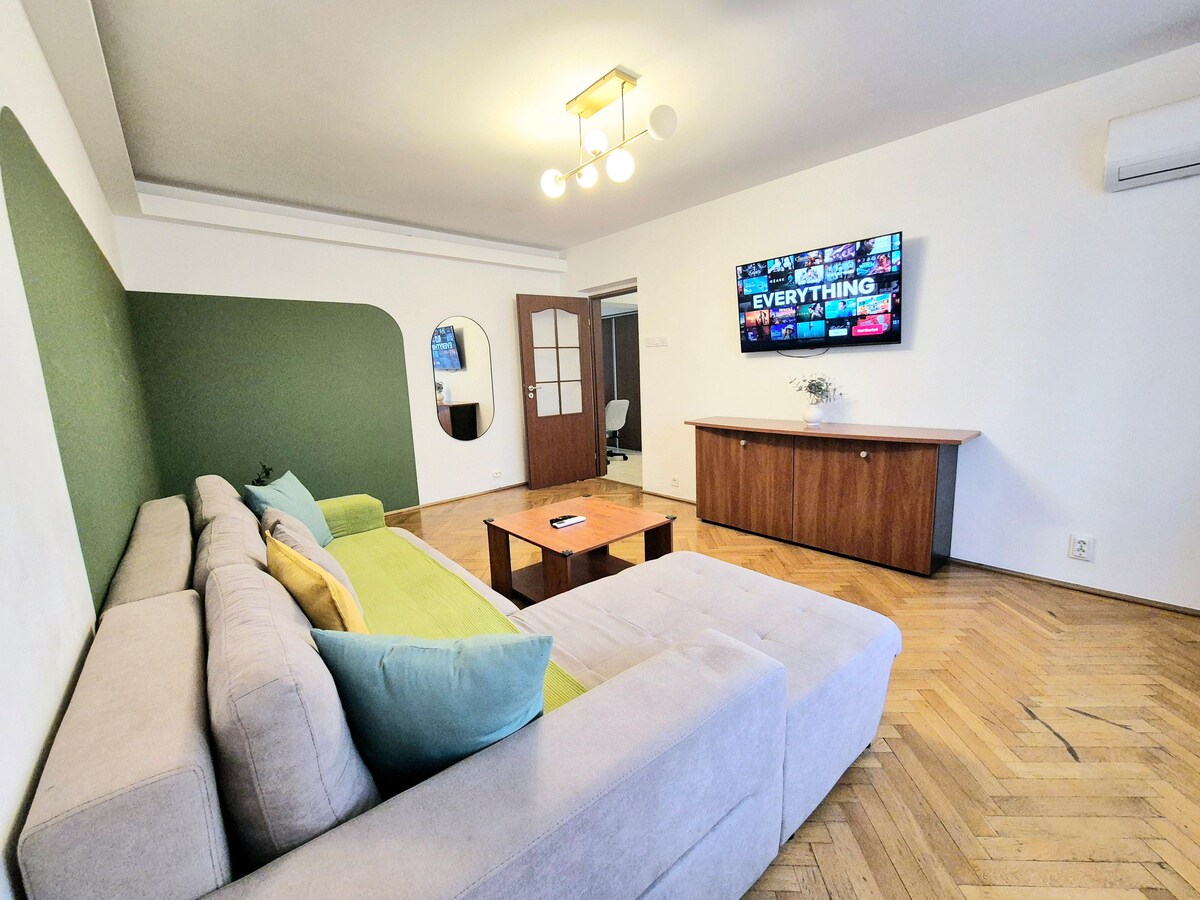 Stylish apartment located in the old city center, with amazing view of the city (14th floor), 2 minutes from the liveliest streets of Bucharest, 4 min walk from the main subway station and from the airport shuttle bus stop. My apartment is ideal for a traveler or a couple looking for a cozy place in the heart of Bucharest, near the best bars & clubs, a couple of minutes walk from the city's main attraction: The People's House. Supermarkets, ATM and public parking available downstairs.