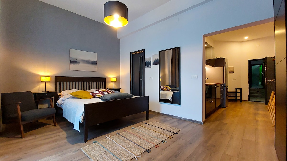 Experience the charm of our urban loft in the heart of the city! Enjoy the peace in our elegant bedroom, with wide windows that fill the room with sunlight, and settle into a luxurious marble bathroom. Located in a lovely neighborhood, this inviting space offers a fully equipped kitchen, a relaxing living area, and a small balcony. Perfect for the modern traveler who values style and comfort. Book your stay - delight in the simple luxuries and make this loft your personal hideaway.