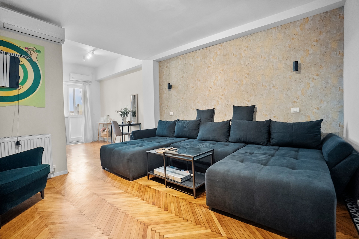 This exquisite 2 Bedroom apartment is located in the heart of Bucharest at the border between the vivid city and the Old Town. Location wise it doesn't get any better than this. From the balcony you have an amazing view over Calea Victoriei Boulevard and the old town. The place is easily accessible by public transport (bus & metro). This beautiful flat was fully refurbished in August 2020 with high standard materials and has all possible amenities available for a perfect stay.