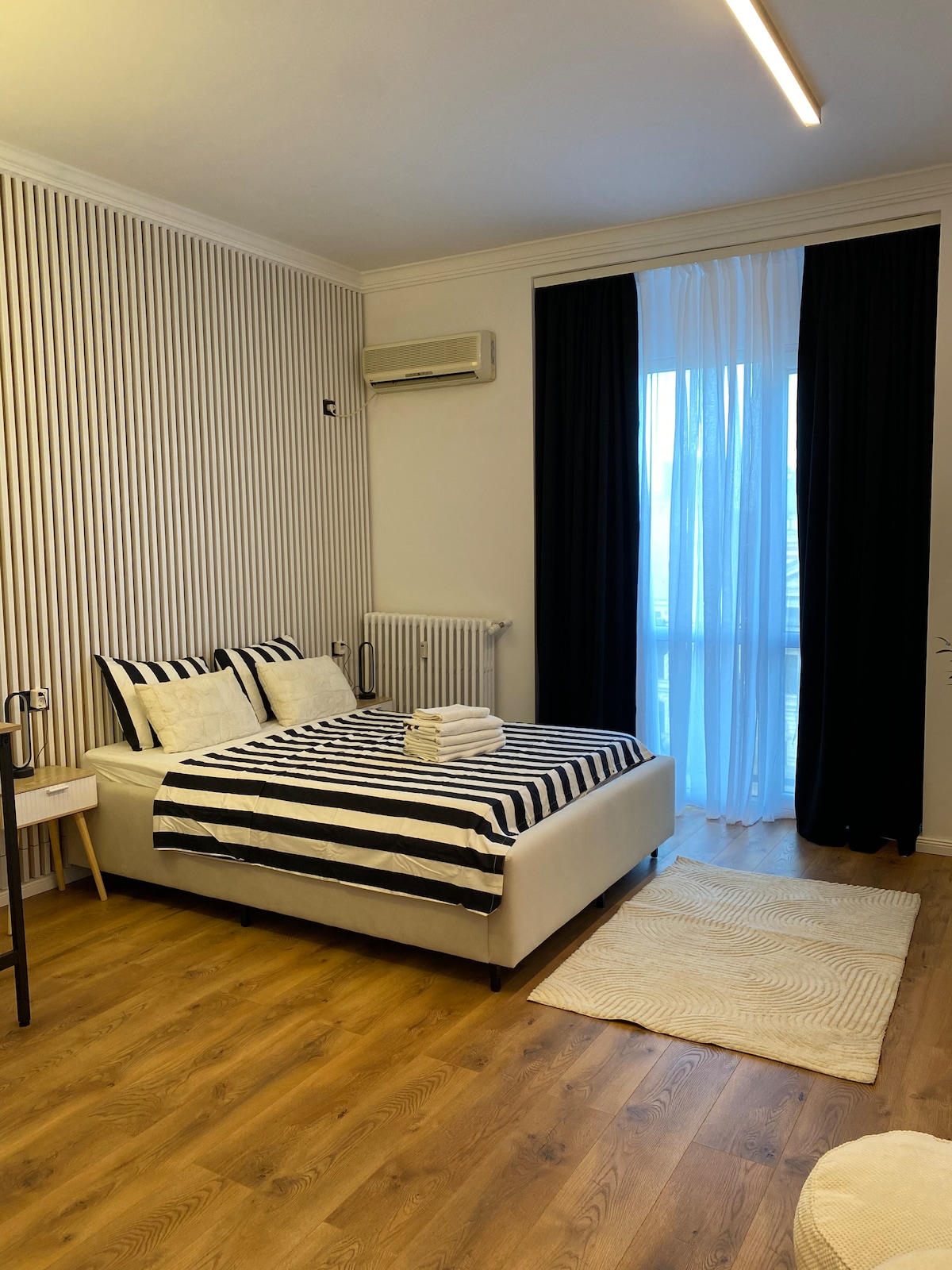 We offer a spacious two room apartment, with a double bed in the bedroom, an extendable sofa in the living room for 1 or 2 people. The base price is for 1 or 2 persons and only one bed. Please consider that In case you want to reserve the apartment for 2 persons and you want to sleep separately , an extra tax of 100 RON for the extra bed will be required.