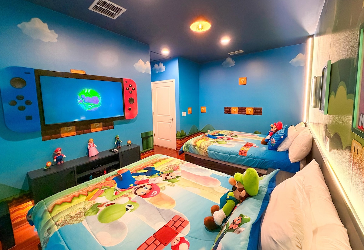Adorable and immaculate Tiny house Queen Bed in Master Loft with 2 twin beds- kids love to sleep up there ! Upper loft with 2 twin framed beds with new mattresses in Disney theme. Loft accommodates 2-4 children. We also have a Brand new pack and play for your infant or toddler if needed on the loft . The pack and play can be placed anywhere you desire.
