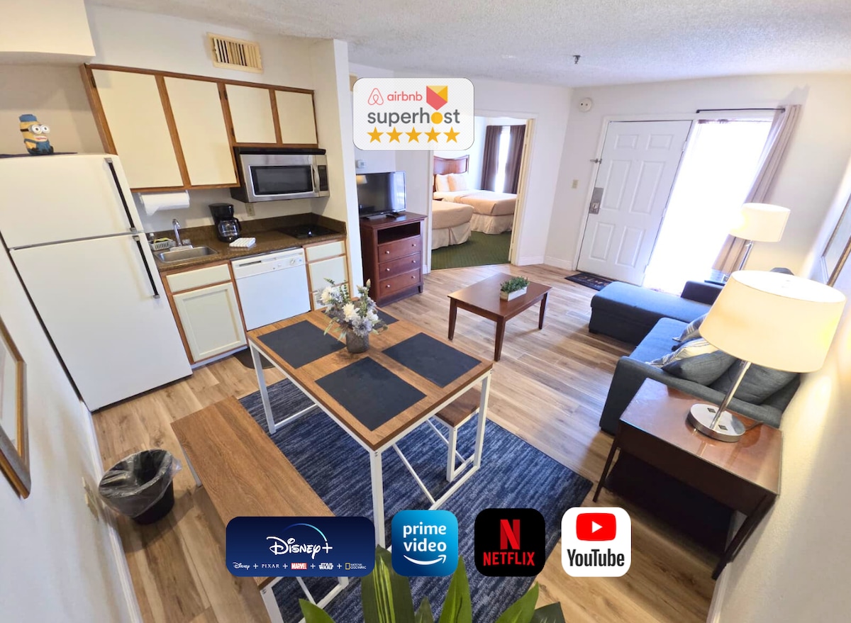 Welcome🌞 This unit is on the first floor! Your much-deserved fun vacation away from home starts here 😎! Located in the heart 💗 of Walt Disney World and all Kissimmee and Orlando’s best attractions 🎢 Includes a comfortable king-size bed and a BIG SMART TV with Disney+, Netflix, and Amazon Video — perfect for relaxing after a fun-filled day.✨ 🚗 NEED A CAR? Ask us about our 8-passenger minivan. You can plan your stay and car rental all in one go. Ask us for the link!
