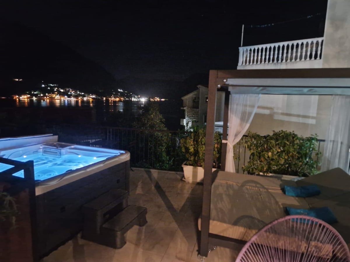 Designed for couples + digital nomads. Wake up to Balkan sunrises, turn the Adriatic into your office, and wind down in a rooftop spa under the stars - Private rooftop terrace with a hot tub & panoramic views of Kotor Bay - High-speed WiFi & dedicated workspace - Modern interiors with floor-to-ceiling windows - Fully equipped kitchen - 5-minute walk to Virtu Beach + Shanti Spa & Gym (guest pass available for purchase) - 40-minute scenic promenade to Old Kotor with waterfront cafés & restaurants