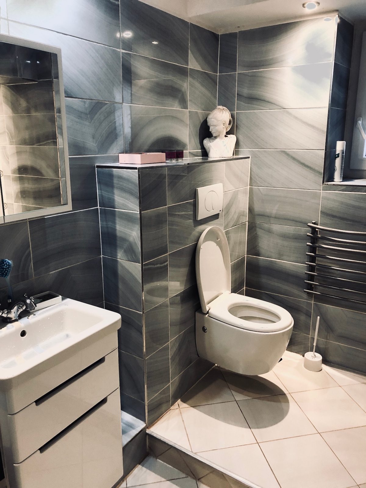 This is a compact, yet comfy, bright one-bedroom apartment with wooden furniture and French windows that is great for accommodating one person. It has a storage unit, a big TV on the wall and a fully equipped kitchen. (The kitchen is shared with 3 other apartments). The design of the bathroom is minimalistic but underlined with warm colors and large tiles.