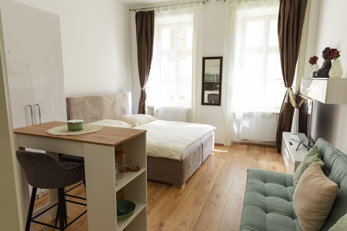 A new, luxury, one bedroom apartment in recently renovated historical building in the old center of Prague. The apt. has very modern interior combined with classic wooden elements. There's a quiet bedroom with double bed and a high quality mattress, a fully equipped kitchen, a comfortable living room with a sofa bed and a separate bathroom. Fast internet. The apt. is perfect for two but it comfortably hosts up to four guests. The building has 24/7 receptionist and security on duty.