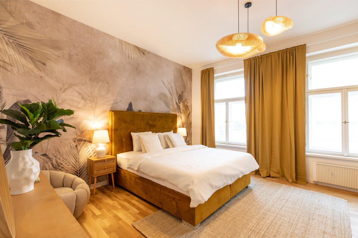 Enjoy staying in my beautiful Jugent Stil home built in the 1890s but recently renovated with all the modern amenities one could wish for including built-in Aircondition in all rooms. Beautifully decorated two-bedroom apartment with historical high ceilings decorated in ornate stucco moldings, mid-century and modern furniture throughout, bathroom with large bathtub and separate toilet. The ideal place to call home while in Prague either for a weekend trip, business trip, or longer stays.