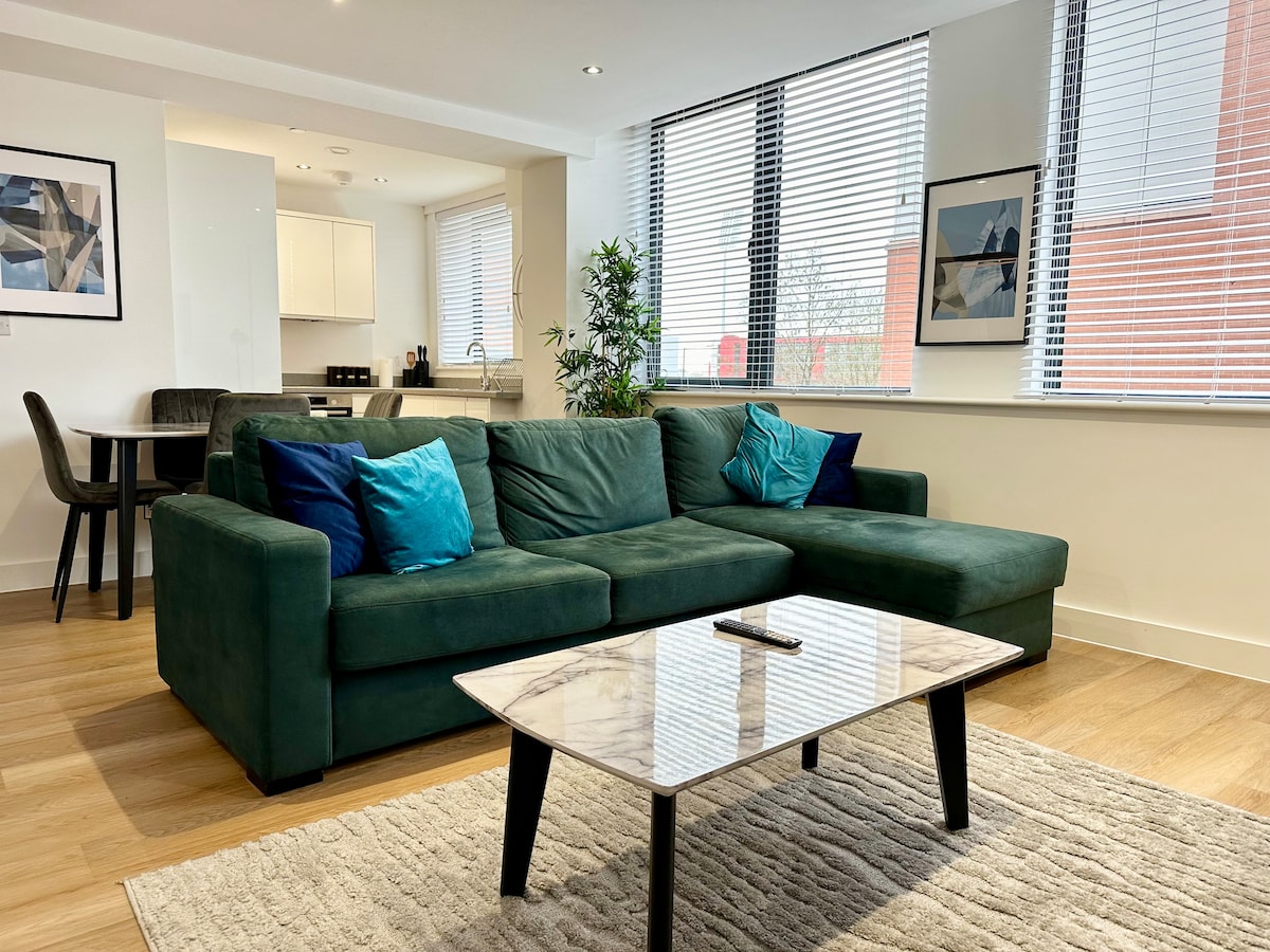 A Brand new Luxurious 1 Bed Apartment with a Sofa Bed styled with premium oak furniture. Its Bright, Spacious & Comfortable Situated conveniently across from Emirates Old Trafford and merely a 5-minute stroll to the legendary Manchester United Stadium, it offers a prime location. Moreover, a brief 5-minute walk will lead you to the tram stop, providing direct access to the bustling City Center. Experience the perfect blend of history, sports, and entertainment during your stay