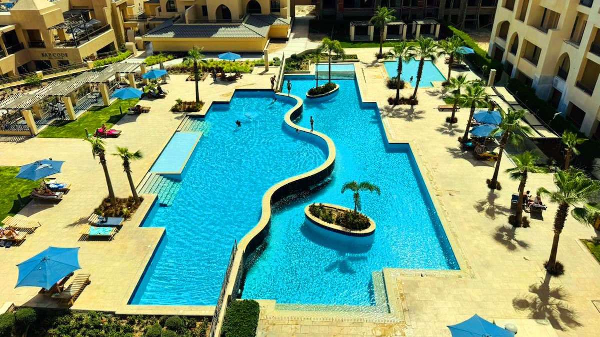 Luxury resort Al dau Heights in the heart of Hurghada city in the beginning of Al mamsha -5 minutes to the airport the studio is 60 sqm has a stunning Sea view and pool - Balcony on the living room with view to the pool and sea view and a seating corner - Living room with a 43 TV, a sofa bed for folding out and a dinette - Kitchen: cooker, washing machine kettle ... - Pool + kids pool, sunbeds and umbrellas - next beach in 100m, next diving centre in 200m -The resort has shopping center, restaurants, cafes, gym and garage - 24 hour security, reception - 5th floor, elevator available water is included and electricity isn’t included it’s as per the guest consumption