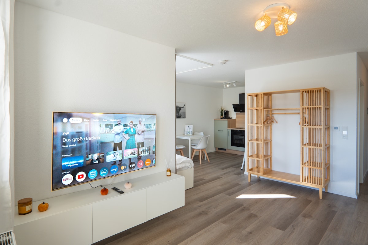 Guter Schlaf ist wichtig! Deshalb betten wir Sie auf einem komfortablen Boxspringbett 1,80 x 2,00 m und Matratzen unterschiedlichen Härtegrades. Blütenweise Bettwäsche & Kissen unterschiedlicher Größe lassen Sie gut träumen. Das Wohnen schmeichelt mit einem Ess- & Arbeitsplatz in charmantem Weiß. Ein Designsessel in der Farbe Orange verschafft einen bequemen Sitz. Das Sofa (Liegefläche 1,40 x 2,00 m) bietet weitere Schlafmöglichkeiten. Freies WLAN, Fahrradkeller & ein Balkon warten auf Sie!