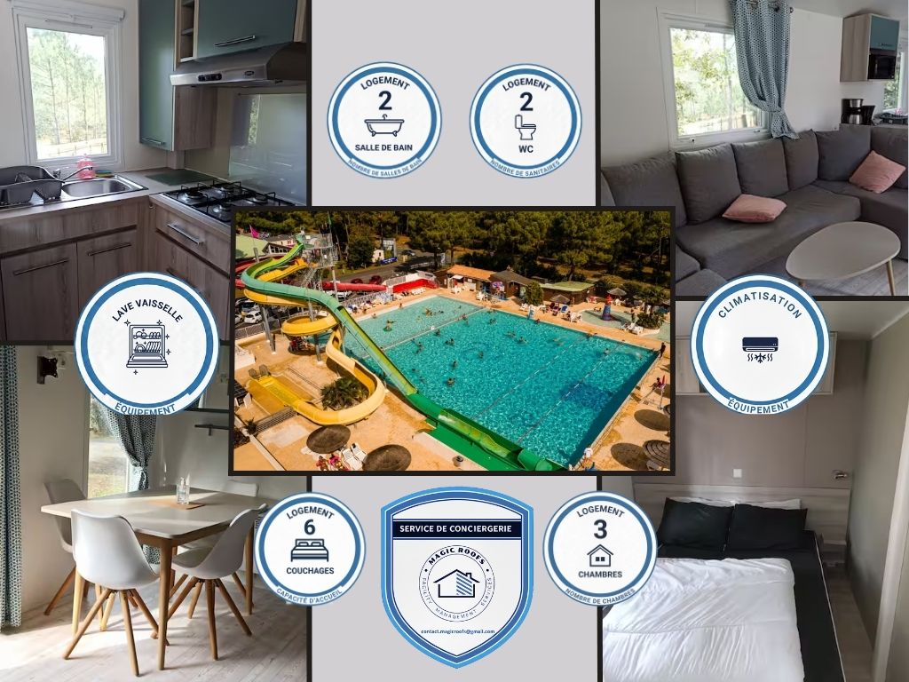 MobilHome 406-CAMPING SIBLU LES CHARMETTES 4*AUX MATHES Récent en très bon état, très bonnes prestations de 6-8 pers, climatisé, composé de 3 chambres, 2 SDB et 2 WC Grande Pièce à vivre Cuisine avec four, micro-onde, lave-vaisselle et frigo-congélateur Un lave-linge Couchages modulables (2 lits simples ou 1 lit double) Belle terrasse équipée et couverte WIFI gratuit Proche Fun Zone Ménage et draps en supp Chèques caution et ménage demandés Prévoir Fun pass € Parc aquatique au 04 avril