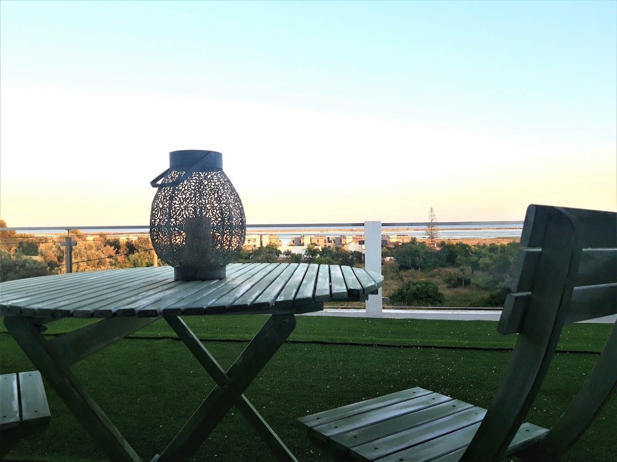 Wake up to a fantastic view of the sea. Luxurious apartment, ideal for a couple, located in the fishing village of Fuseta, 10 minutes walk from the marina from where you can take the boat crossing to the idyllic beach. Restaurants, bars and markets are also nearby. New apartment within a small condominium of 2 houses, in a quiet area with a shared pool. A bright apartment with a fantastic terrace to relax at sunset.