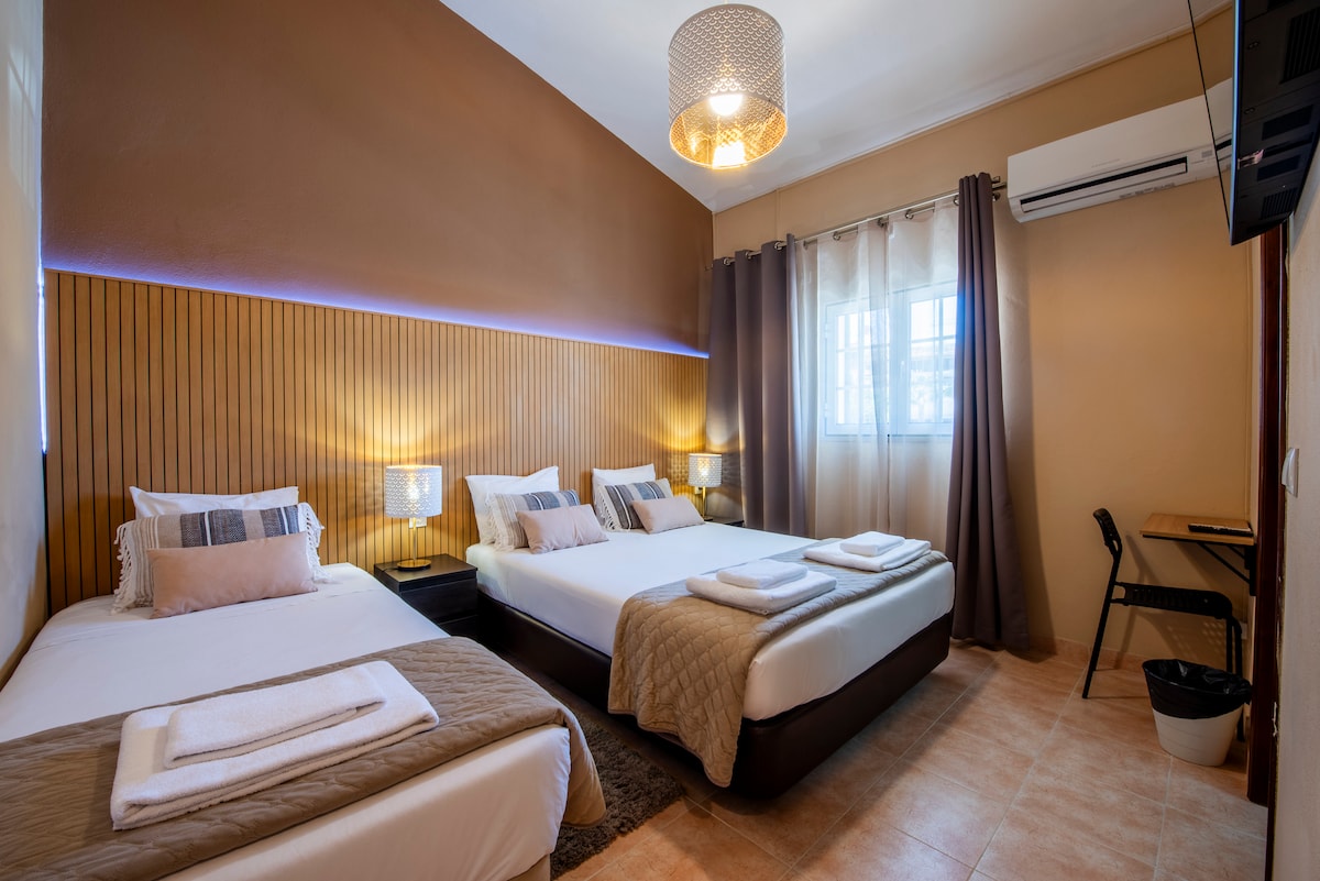 Quarto Duplo - Com uma dimensão entre os 15 e os 20m², os nossos elegantes Quartos Duplo Clássicos dispõem de uma cama de casal, Tv Lcd, secretária com poltrona e casa-de-banho privativa com banheira ou duche. É permitindo o alojamento de um 3º hóspede (taxa extra) ou berço gratuito (mediante solicitação). Quartos com acesso Wi-Fi gratuito. Fabuloso pequeno-almoço incluído!