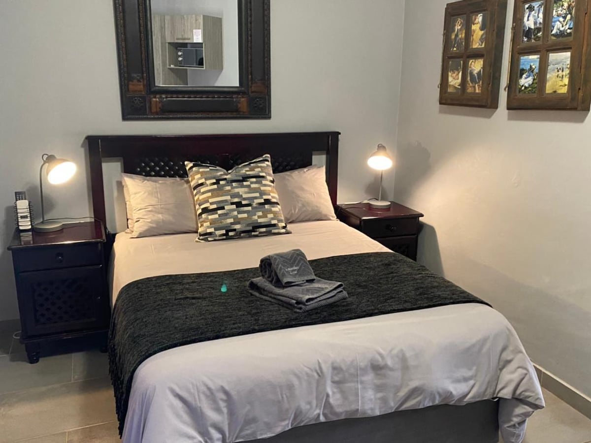 Private luxurious flatlet attached to our home. It is equipped with a queen bed, kitchenette, and air conditioning. The kitchenette has full sets of crockery, cutlery, kettle, toaster, induction cooker, microwave, air fryer and a concealed bar fridge. The bathroom has a huge spa-like shower and a soft close toilet suite. Free wifi and free access to Netflix, Prime Video and Showmax. Guests can login to their own DSTV account.