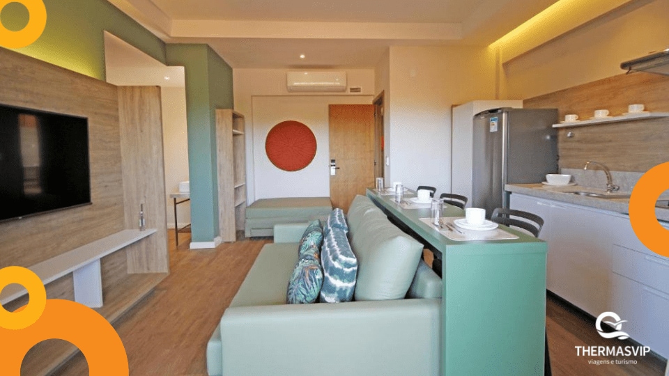 Apartamento completo para Família que busca conforto, lazer e acesso VIP ao Parque Aquático Hot Beach. Possui 1 quarto casal, 1 banheiro, sala (1 sofá-cama e 1 cama extra) integrada com a cozinha (fogão elétrico, micro-ondas, geladeira e utensílios). E varanda gourmet com churrasqueira. Ingressos Promocionais para o Parque diretamente no hotel: R$ 99,00 por dia (por apartamento) para aproveitar o parque todos os dias ou R$ 139,00 por dia (por apartamento) para quem não usar todos os dias.