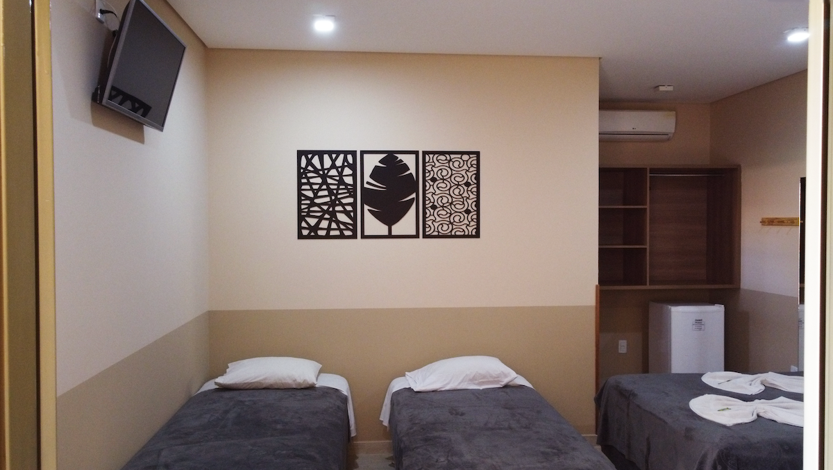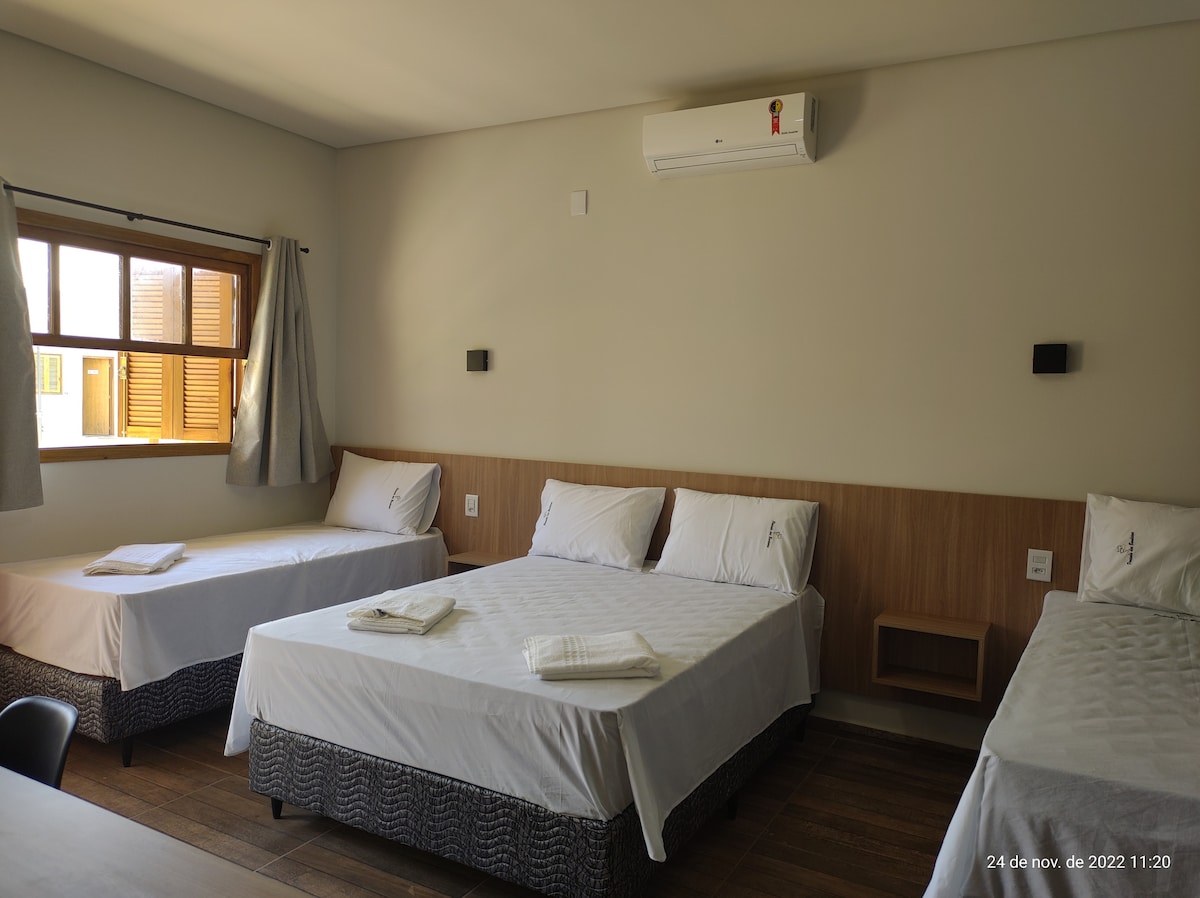 A suíte possui ar-condicionado, frigobar, TV, ventilador de teto, Wi-fi, cama de casal, cama de solteiro e beliche.