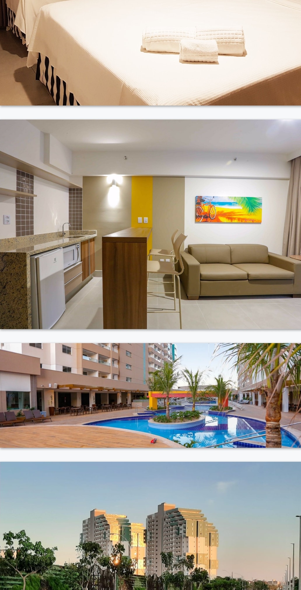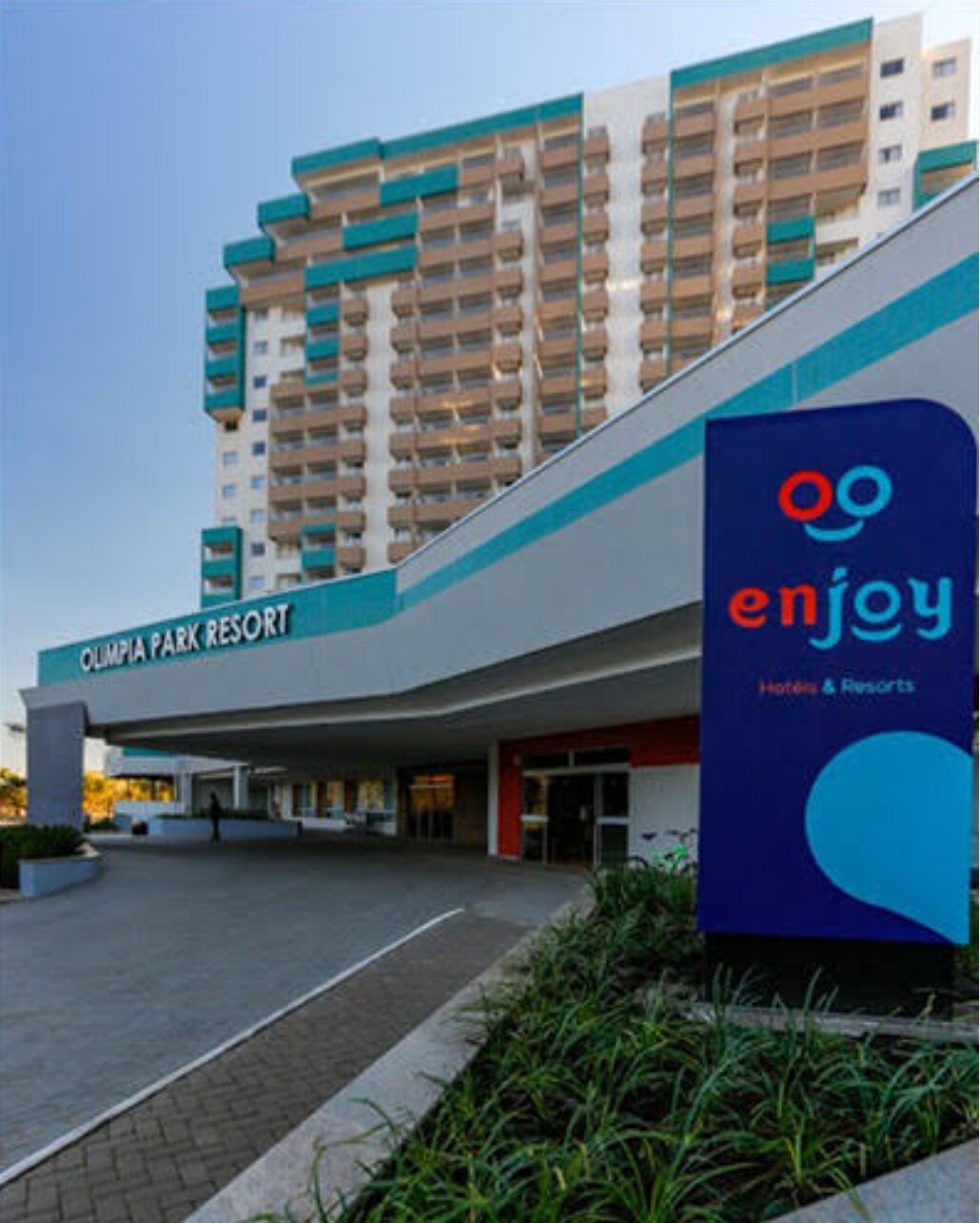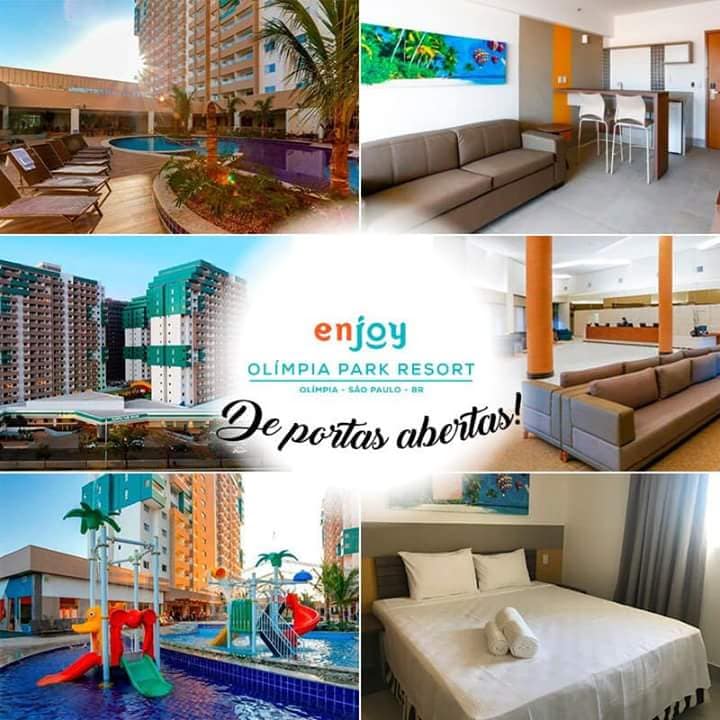 Apto novo de um quarto no Enjoy Olímpia Park Resort, ao lado do parque Thermas dos Laranjais em Olímpia - SP. O apto possui uma ampla sala de estar, com sofá cama, cozinha americana, banheiro, quarto com 1 cama de solteiro e uma auxiliar, mais uma cama de casal, banheiro com ducha a gás, secador, toalhas, Wi-fi, ar condicionado, estacionamento coberto e fácil acesso ao parque.