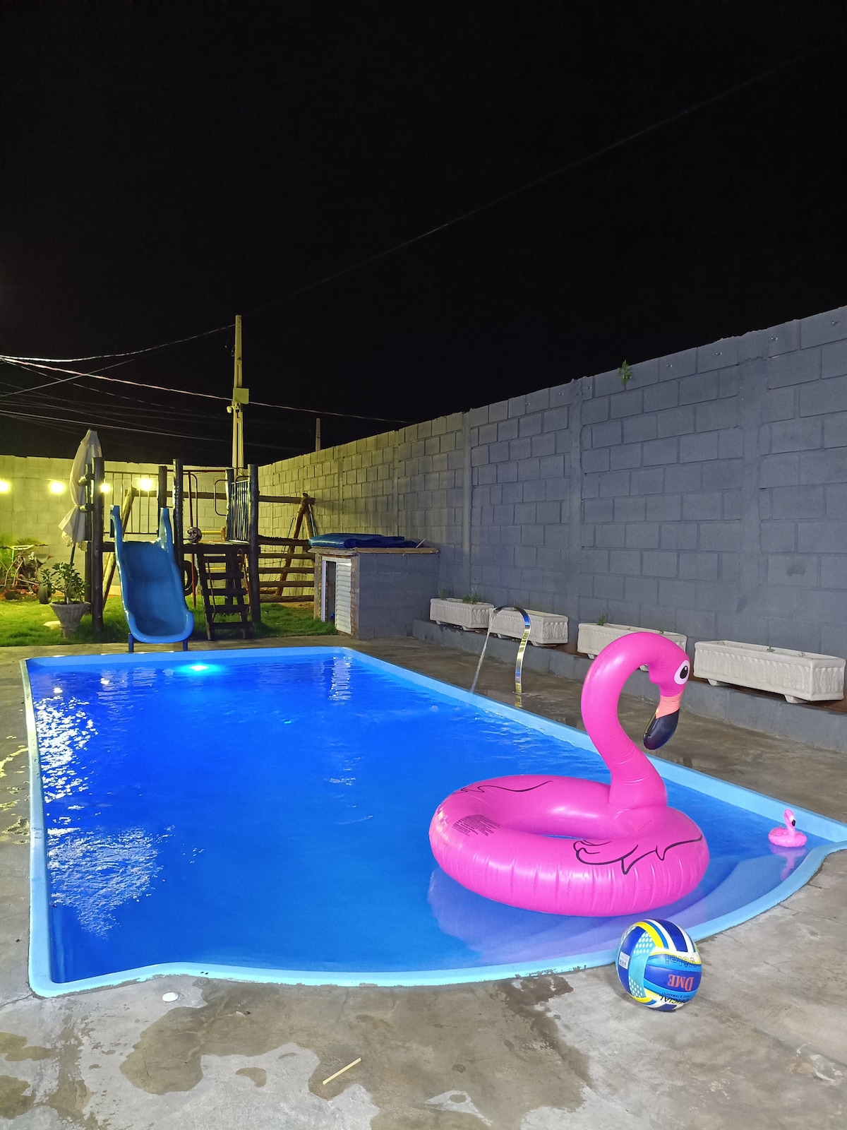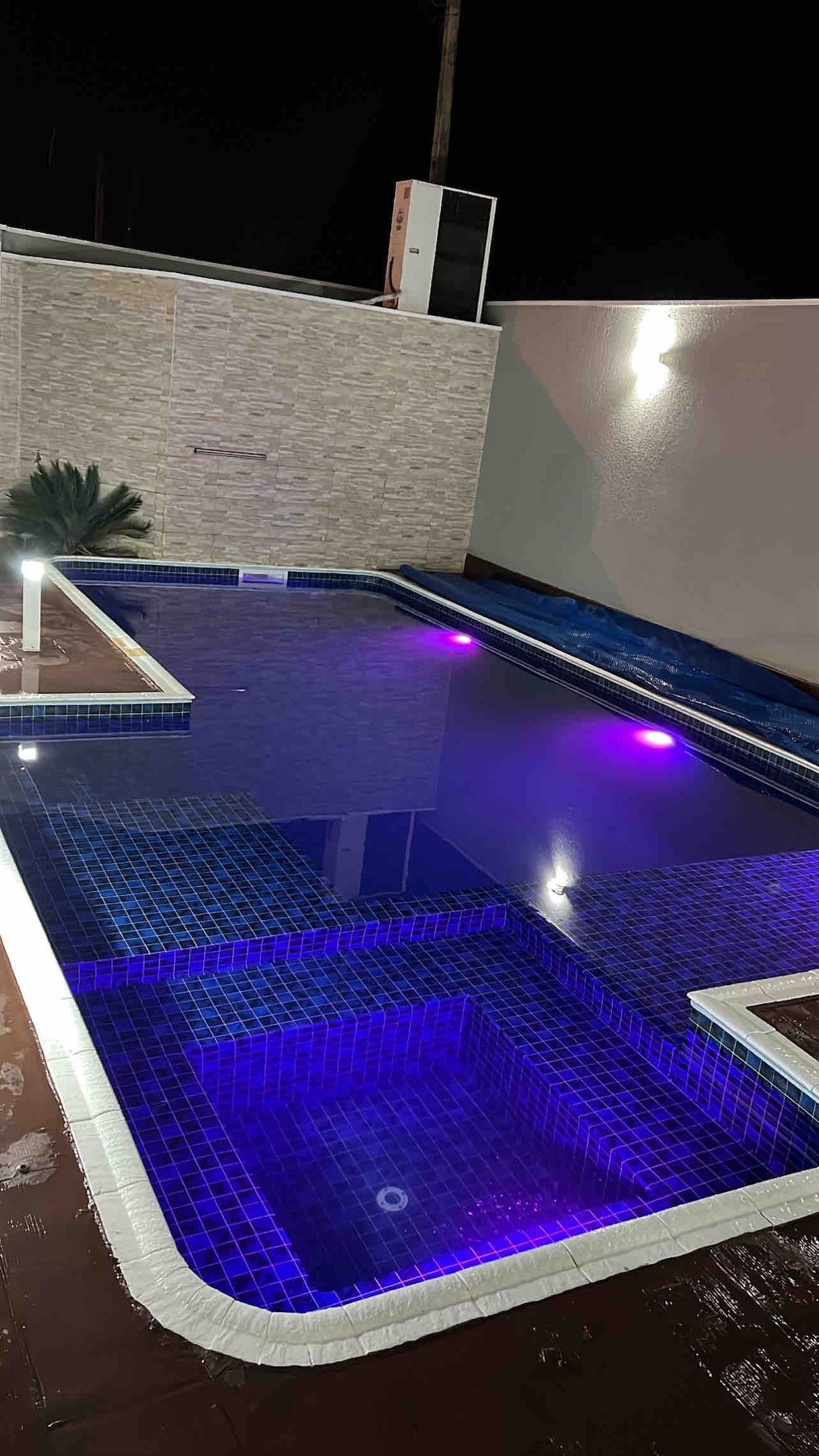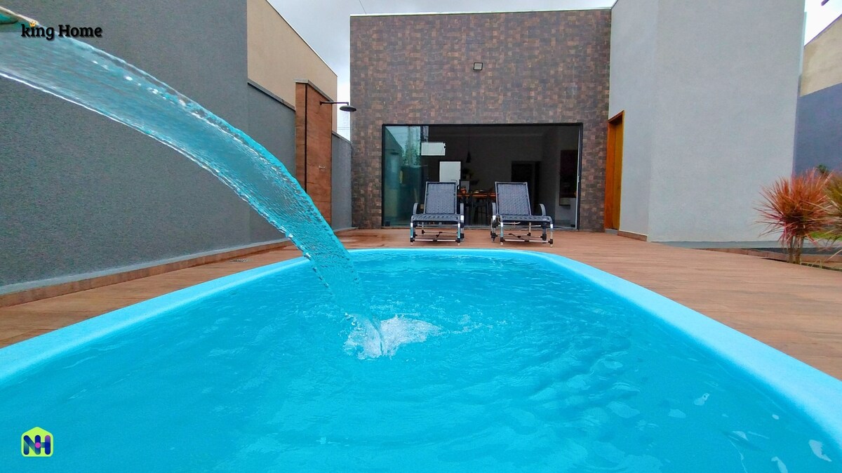 Possui piscina com aquecimento elétrico, com hidromassagem e cascata, área com churrasqueira, 3 quartos sendo 2 suítes independentes, todos com ar condicionado e ventiladores de teto, banheiro social, cozinha equipada, sala com Tv à cabo, Wi-fi e garagem para 03 veículos. Está muito bem localizada, próxima à padaria, açougue, pastelaria, hamburgueria e esfirraria; a 500 metros do supermercado e de 7 a 10 minutos dos parques, trajeto de fácil acesso.