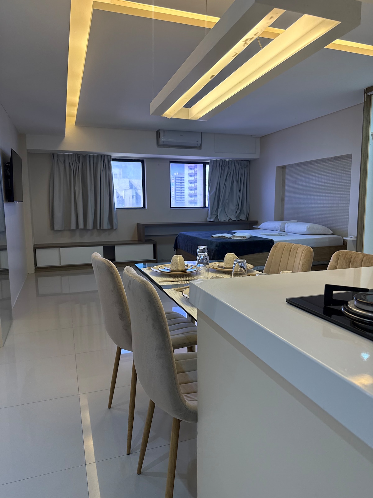 Bem-vindo ao *Studio Exclusivo na Boa Vista*, ideal para quem busca conforto e praticidade no coração do Recife. O flat é moderno, possui cozinha compacta, Wi-Fi, ar-condicionado split, Smart TV, banheiro privativo chuveiro elétrico, cama de casal e sofá cama. Localizado a poucos minutos de pontos turísticos e comerciais, como consulado Americano, Shopping Boa Vista e Shopping Tacaruna, oferece fácil acesso a transporte público. Proibido fumar ou incenso. 🚨PISCINA INTERDITADA NAS SEGUNDA FEIRA