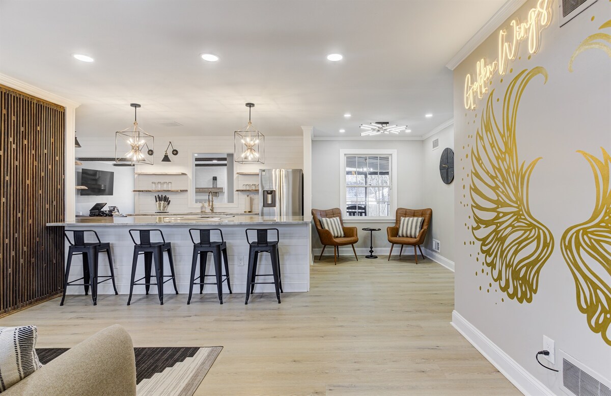 Welcome to Golden Wings, a stylish 3BR retreat in East Memphis. Enjoy a king suite, cozy queen rooms, custom murals, and a fully stocked kitchen with dual Keurig. Relax in the private hot tub or by the fire pit under string lights. Located in a safe neighborhood just minutes from Graceland, Beale Street, and Memphis’ top attractions.