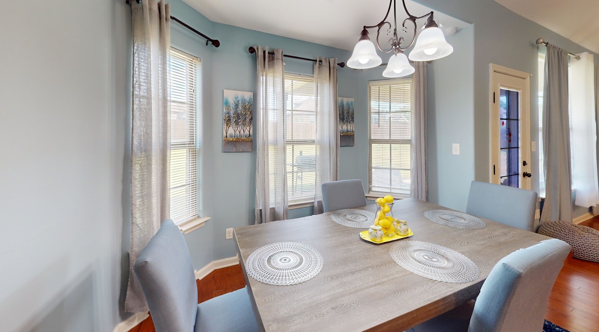 The Space • Smart TVs in the living room and owner suite • Enclosed backyard with patio set • Fully stocked kitchen • Smart washer and dryer • Central AC and heating • 2-car garage plus driveway parking • Keyless entry • Super-fast WiFi • Dedicated workspace Sleeping Arrangements • King bed in owner suite • Queen beds in other bedrooms Additional Features • Owner suite with soaking tub and shower • Dining room • Reclining couch • Exterior security system