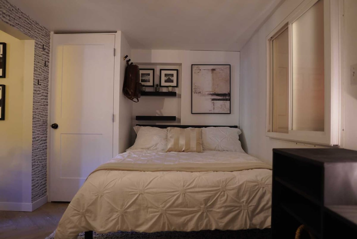 Kick back and relax in this calm, stylish space with private garden patio. Perfect central location just 5 minutes walk from Tucelnuit Lake, with over 40 wineries within a 30 minute drive. Walking/cycling to trails and downtown. Private entrance with keypad entry. The sunny suite is a garden level walkout with fully equipped kitchen. Living room is equipped with a fold down queen sofa bed (suitable for one adult) and smart tv. 1 spacious bedroom with luxurious king bed and high quality linens.