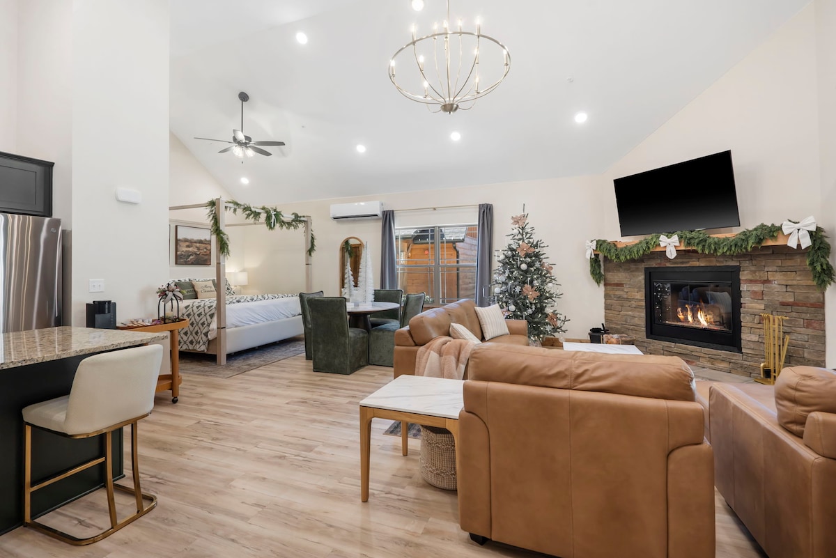 Nestled in the heart of Tall Timbers Resort, The Maple Hearth is the perfect one-room retreat for couples seeking a cozy getaway. This charming cabin features a private hot tub, a wood-burning fireplace, and a luxurious soaking bathtub for ultimate relaxation. A fully stocked kitchen invites you to craft meals together to enjoy indoor or on porch. Surrounded by nature, the resort boasts fishing, an indoor/outdoor pool, & pickleball courts, offering the perfect blend of adventure and tranquility.