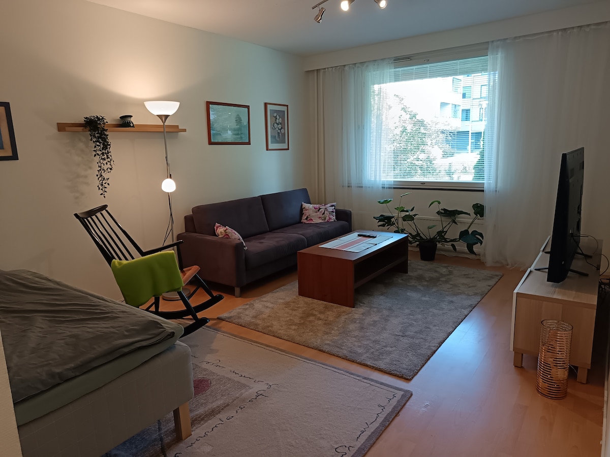 Hyvällä maulla sisustettu valoisa uusi kaksio aivan kauppakeskus Puuvillan vieressä. Asunnon sijainti on hyvin keskeinen mutta kuitenkin ilman liikenteen melua. Keskustaan n.1km, Kirjurinluotoon 900m. Huoneistossa on kaikki tarvittavat kodinkoneet sekä kuivaava pyykinpesukone. Parivuode ja kahden hengen vuodesohva. Tarvittaessa käyttöön saa lisäksi varavuoteen yhdelle. Huoneistossa 55 tuumainen TV, radio ja Wifi/valokuitu. Viihtyisä patio pihakalusteineen ja autopaikka pihassa.