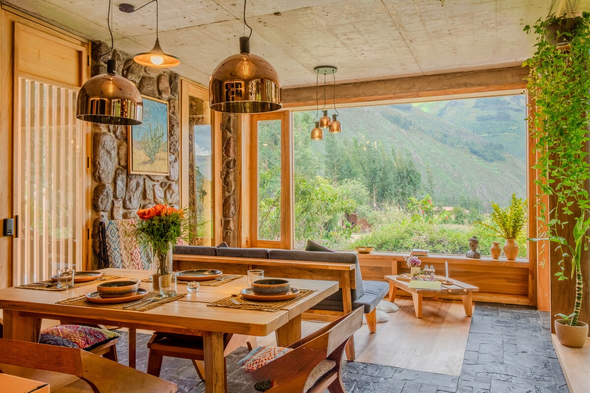 Perched on a slope, this industrial-chic sanctuary offers an ELITE 180° FRONT-ROW SEAT to the Sacred Valley through FLOOR-TO-CEILING GLASS. Tucked within a private condominium of modern homes and neighboring farms. A scenic 10-min walk from the road and boutique cafes and 50 min from Ollantaytambo train station, an ideal retreat for ACTIVE TRAVELERS and MACHUPICCHU visitors. King bed with LUXE LINENS and SPA ROBES. RELIABLE DRIVERS available for transfers and excursions.