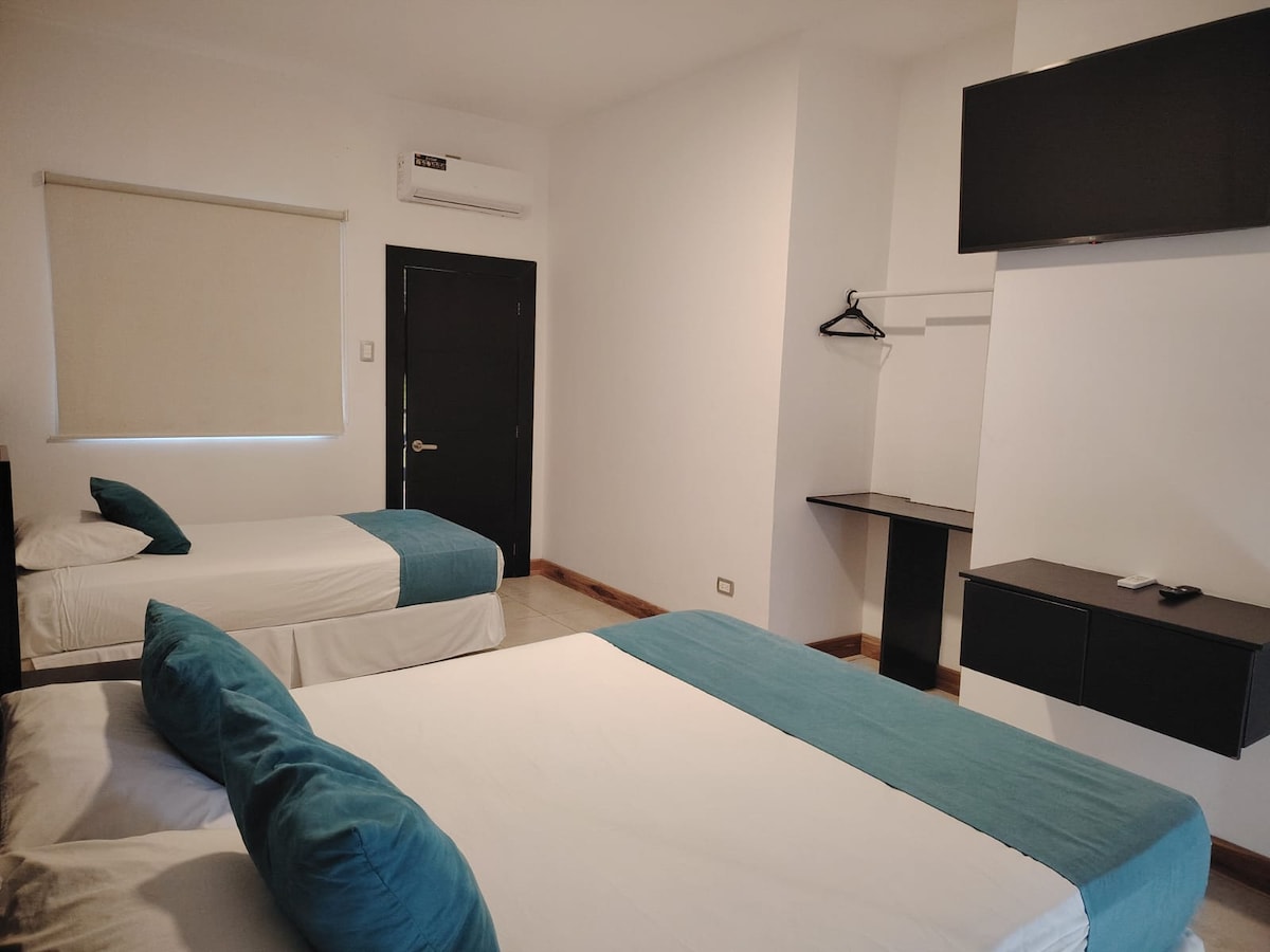 Habitación matrimonial, con baño privado y ducha de agua caliente. Con una espectacular vista al mar y un balcón de ensueño. Tiene A/C, acabados en piedra, wifi y más. Hay áreas comunes como una playa exclusiva, piscina de línea infinita y una galería náutica. El hotel se encuentra en una de las zonas más bellas de ballenita al pie del mar.