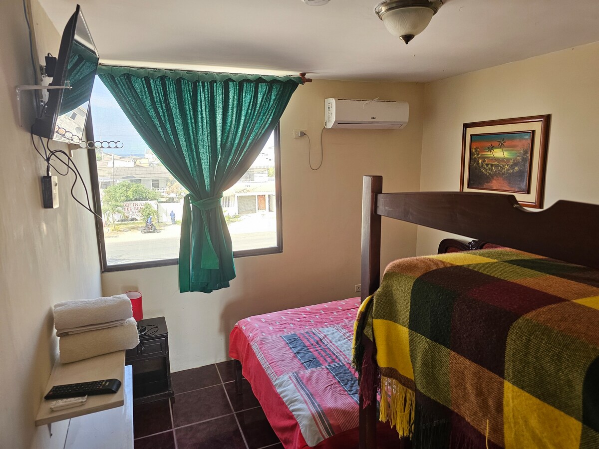 Amplia suite matrimonial con vista hermosa al mar, estamos cerquita de la playa. Estamos ubicados en la zona del surfista de montaña, a unos pasos de la playa, una zona tranquila y segura, contamos igualmente con cámaras de seguridad y garaje privado. Del centro estamos a 5-6 minutos caminando por la playa.