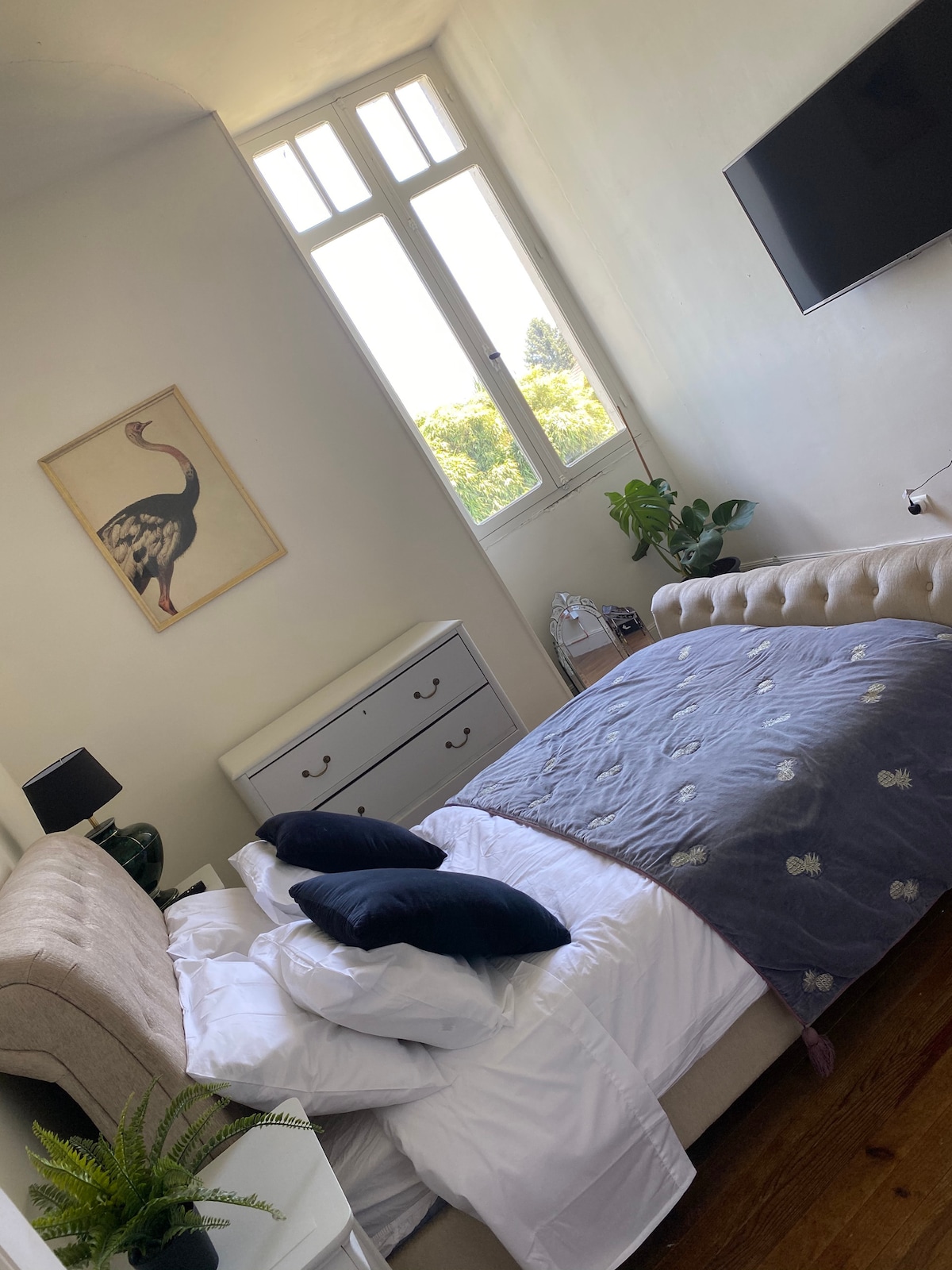 Appartement charmant avec vue sur les Pyrénées. A deux pas du centre ville, du château et son parc. Salon spacieux avec son écran TV géant. Espace bureau indépendant. Endroit calme et ressourçant. Supermarché Carrefour Market à 3 min à pied. Boulangerie à 200 mètres. Nombreux restaurants accessibles en marchant. Places de parking proches. Entre Montagne et Mer à 1h15, une campagne qui donne envie de s'oxygéner.