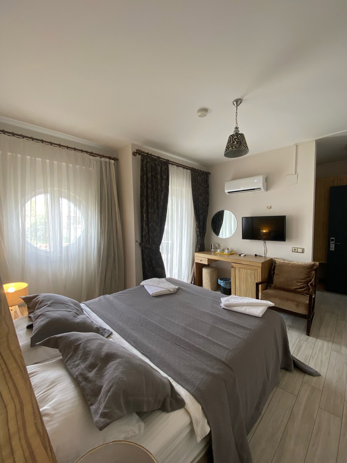 Located in the heart of the city but surrounded by nature, this room offers a breathtaking view of green park view. The park is directly adjacent to the coast, and you can reach the Fethiye promenade in just one minute. Paspatur, which we call the Old Town, is right around the corner, offering souvenirs and local delicacies. The Fish Market is just a 3-minute walk away. Rue Rooms provides a clean and airy accommodation experience with its nature-friendly design.