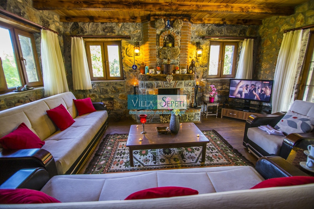Renovated historic stone houses licensed by Tourism Ministry as a "National Monument". Located on a quiet hill at Fethiye's Kayaköy area, with amazing valley views, surrounded by lush nature/mountains. Villa contains 4 separate suites, each has own bedroom, kitchen, bathroom, and a living room or terrace. Fully private/secluded open-air areas include large dining terrace, big pool, garden. Rental covers entire facility and it's a great choice for both large and smaller families or friend groups.