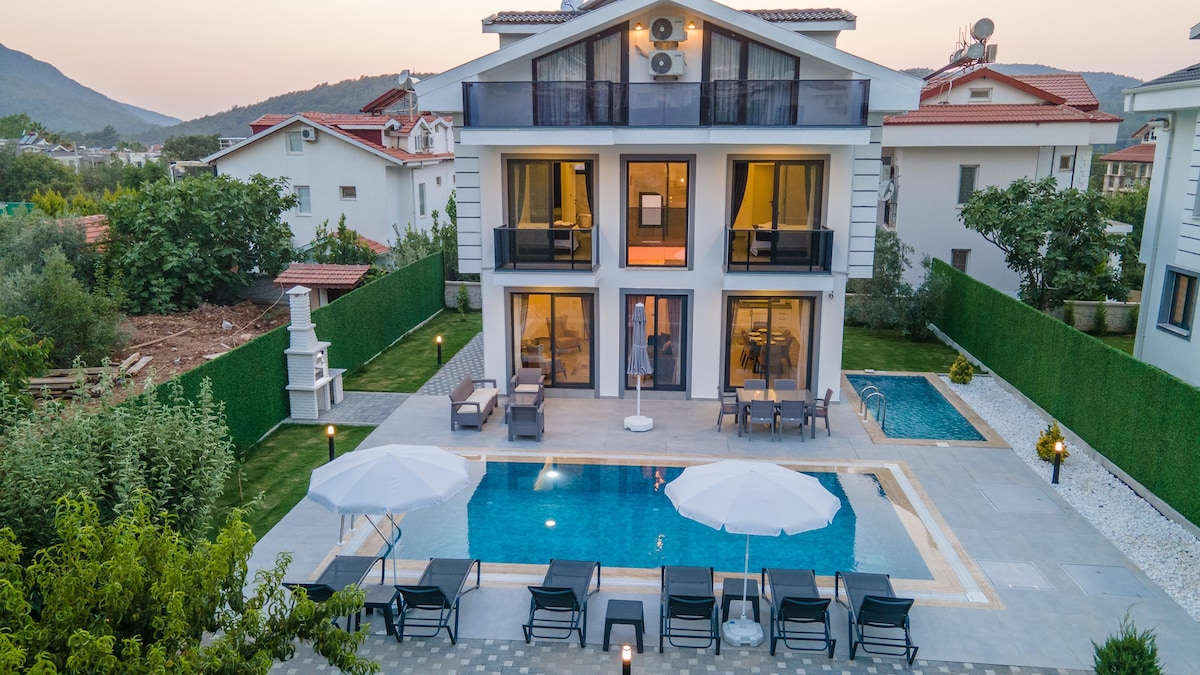 Bu sakin, şık mekânda arkanıza yaslanın ve rahatlayın AÇIKLAMA : Villa Elite Ölüdeniz A : 3+1 6 KİŞİLİK MÜSTAKİL SONSUZLUK HAVUZLU HER ODA MÜSTAKİL BANYOLU JAKUZİ ,SAUNALI ÖLÜDENİZE 5 DK ŞEHİR MERKEZİNE 10 DK MESAFEDE