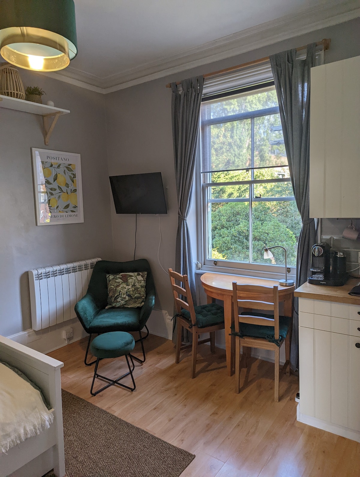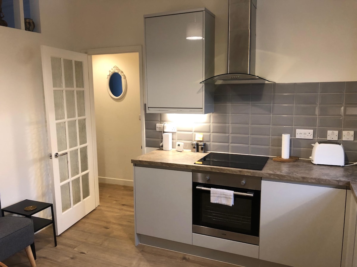One double bedroom with King size bed; a living room. A fully equipped modern kitchen with hob, microwave/grill, fridge/freezer, dishwasher and Nespresso coffee machine; a modern bathroom with shower. The living room has TV and dining table/chairs. Free WiFi All bedding and towels are provided. Quality Egyptian cotton linen. Complimentary toiletries. Complimentary Nespresso coffee pods. Hairdryer. Washing machine Iron and ironing board. Clothes drying rack. Check in 4pm / out 10am