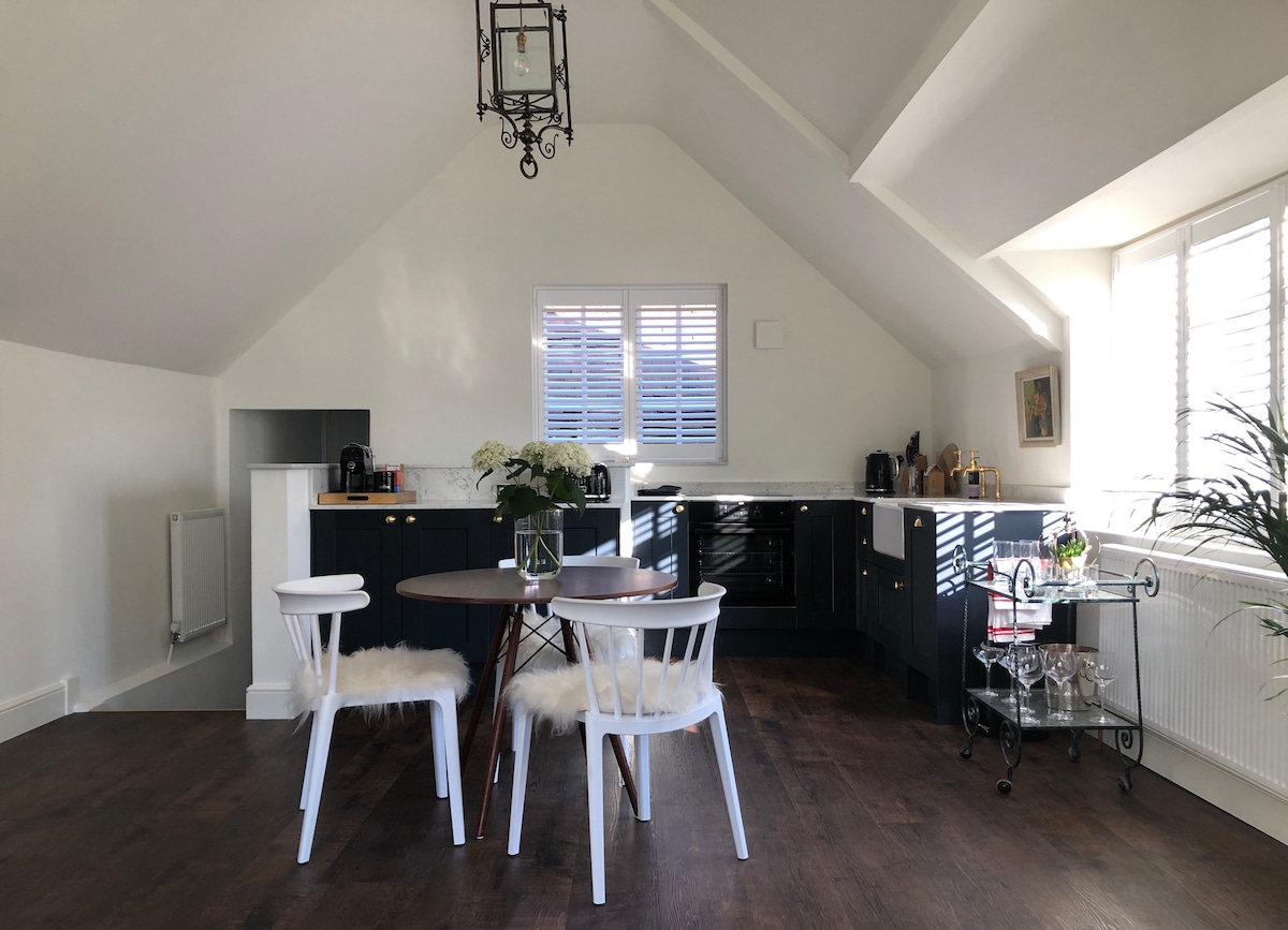Nestled walking distance from Esher High Street the apartment is situated across the courtyard of Clive House, a Georgian dwelling built in the middle of the eighteenth century by Clive of India. The newly refurbished accommodation includes : living area, kitchen/ diner and ensuite double bedroom with a kingsize bed. Living includes a new compact and bijou fully fitted kitchen, dining area with wood burner, luxurious sofa and Smart HD TV/ Sonos sound bar as well as complimentary WiFi.