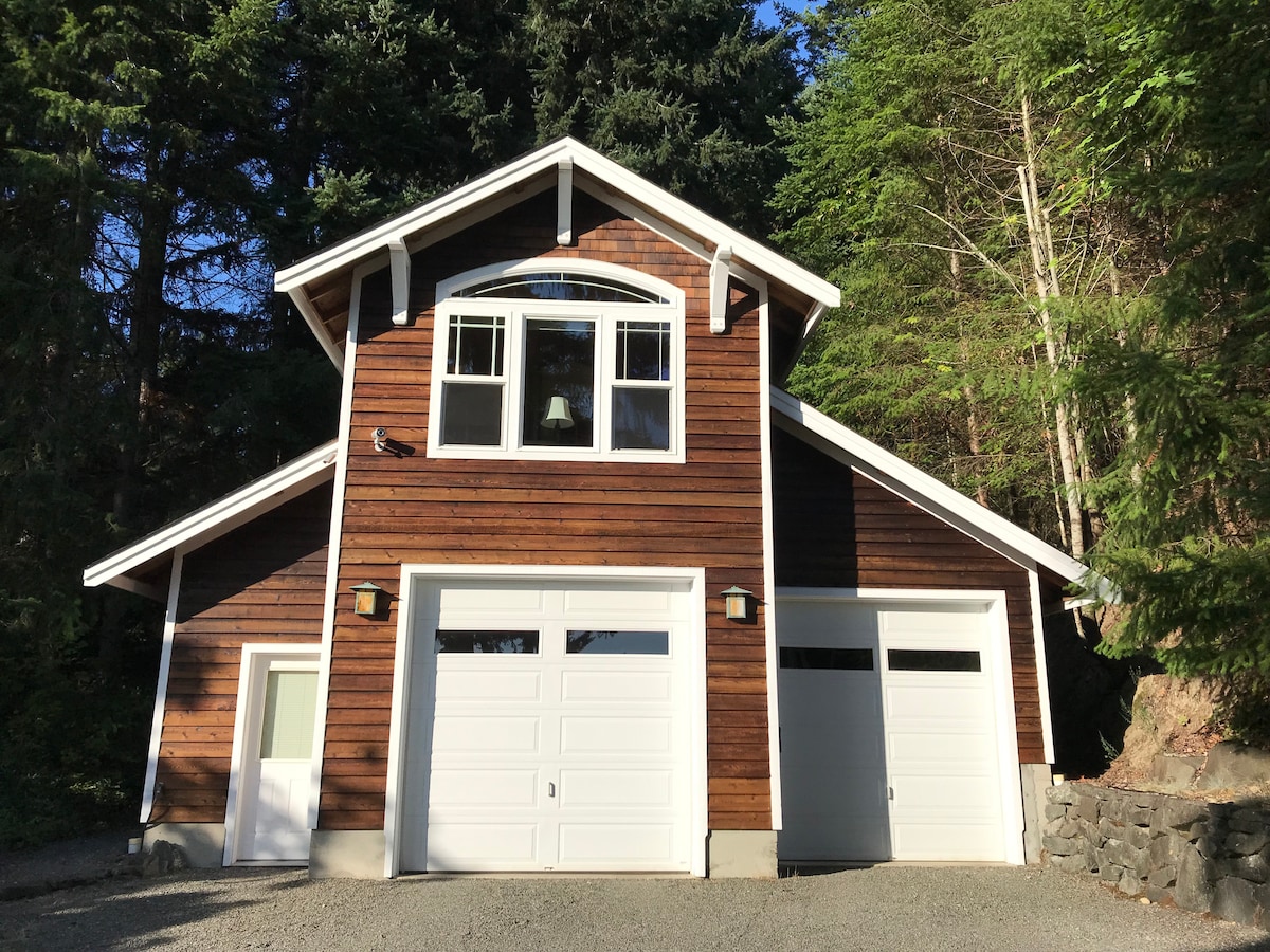 Like a charming chalet in the woods is the feel of this peaceful water view guest house above your garage. Gorgeous ocean views await for you and a balcony opens to the woods from your bedroom. Your kitchen/living room has all needed amenities, but you will be your own dishwasher. Workdesk available. Our place is kept pet free for allergy suffering guests. Zogs pub and small grocery nearby. Gig Harbor is our beautiful commercial community. 3 month schedule