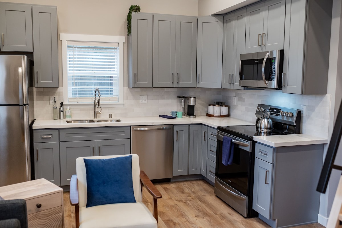 Sweet, detached studio cottage located in the Capitol Campus neighborhood that's within walking distance to the capitol and downtown. Let yourself in with a keycode through the french doors to vaulted ceilings and an open, spacious, cozy feel. Basic kitchenette with microwave, toaster oven, coffee maker & mini-frig. Watch Netflix on the smart TV (or sign in and out of your personal apps). In addition, we installed a ductless mini-split heat pump/air conditioner for your comfort.