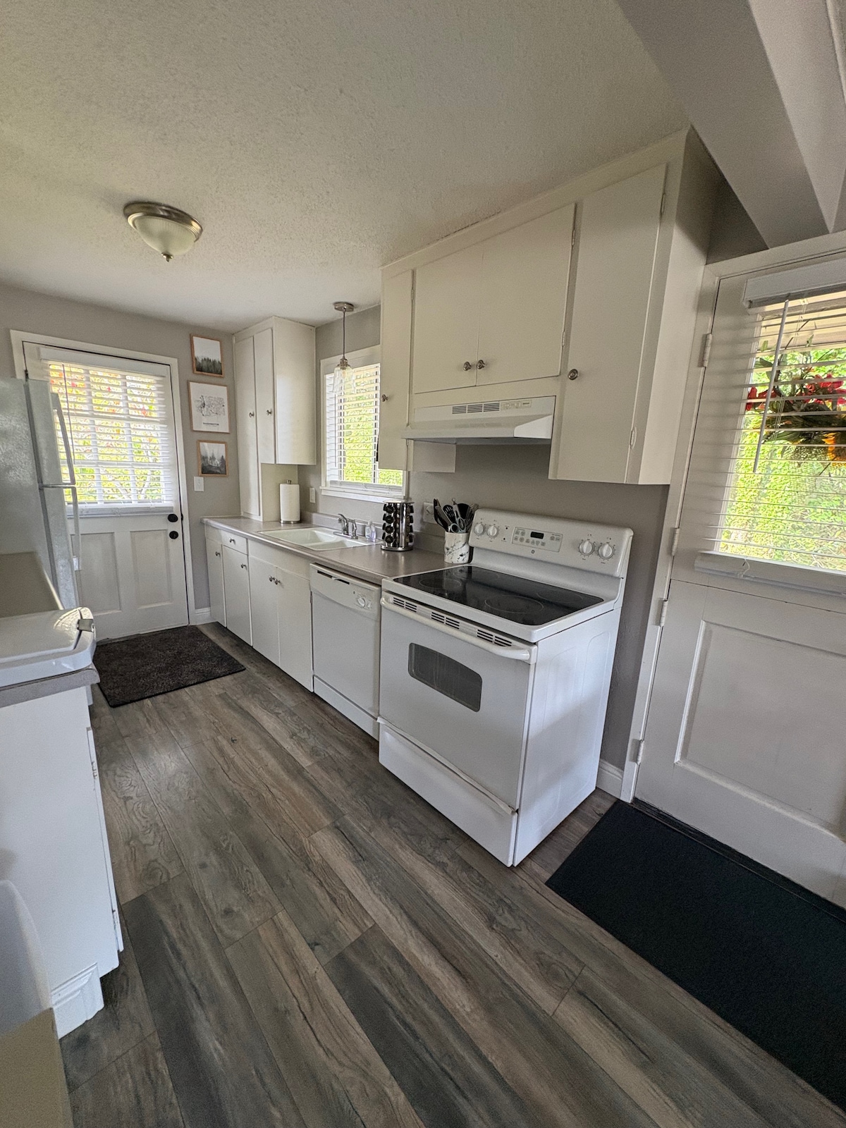 Our bungalow is located in the Chautauqua beach community. It is the perfect location to stay cool in the summer and warm in the winter. While it is not a waterfront property, the beach, known as KVI beach, is a stone's throw away. Central to the interior of the open beamed bungalow is a stone faced Envirotech masonry fireplace. Surrounding the masonry are the living room, office, dining area, kitchen and bedroom. Appliances are Fischer Paykel--propane cooktop & electric oven.