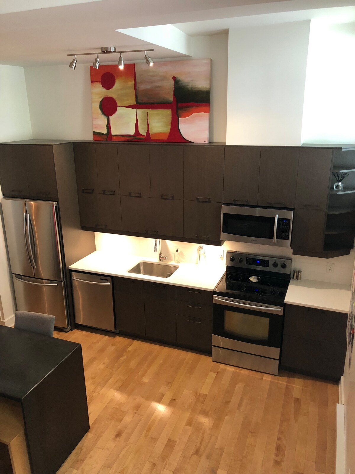 Plaza10 is a modern and stylish single bedroom apartment located in the heart of Rosemont la Petite Patrie (a borough 1 hour walk North or a 15 min public transit ride from downtown Montreal). It’s an area full of restaurants, cafés, shopping and entertainment, making it the ideal place to stay while exploring Montreal. The closest subway station is a 6 min walk away. The space features a fully-equipped kitchens, private terrace, heated radiant floors, electric fireplace in living room & bedroom