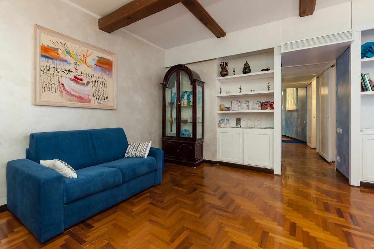 Light the large stone fire and relax with a book in this elegant home overlooking Via dei Banchi Nuovi. Coffered ceilings cap cozy rooms in relaxing, neutral tones accented by designer furnishings and owner's original paintings. This charming fully renovated house is located in one of the most beautiful, ancient and vibrant area of the center of the Eternal City. We also like to offer eco-sustainable hospitality: we use electricity from renewable sources, organic products.