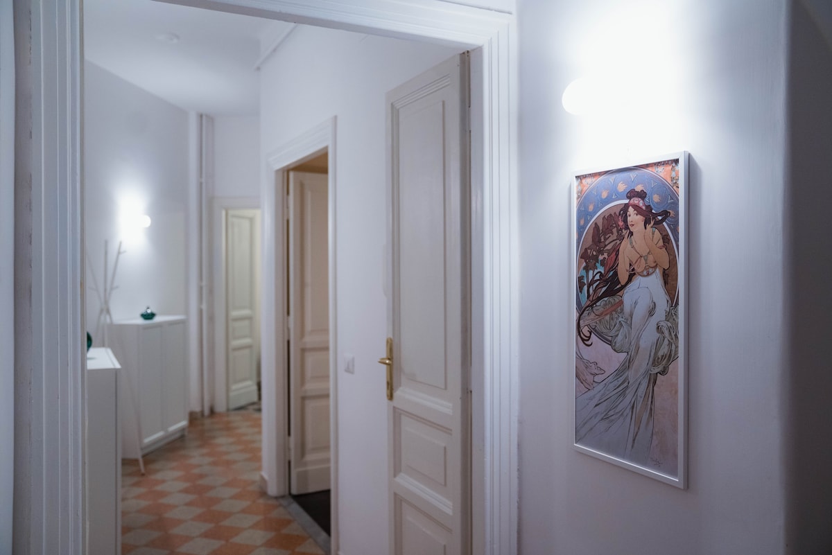 Just 200 m from the Vatican Museums, in an elegant historic building, this apartment blends timeless charm with modern comfort. 1904 floors, late 19th-century tiles, and Tiffany-style glass coexist with contemporary amenities. Furnishings from European capitals create a refined, warm atmosphere where every detail tells a story, making your stay in Rome unique and unforgettable.