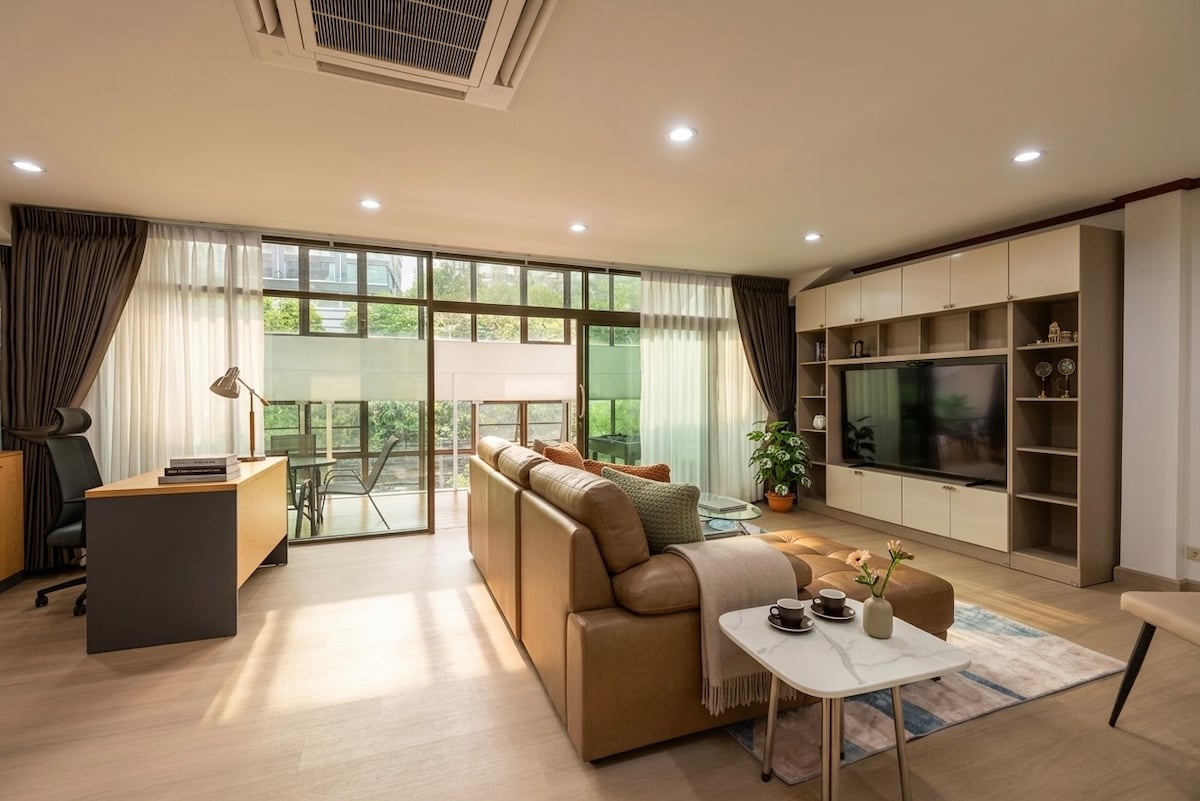欢迎您选择并且入住我的公寓,希望您有一个很棒的泰国之旅。 房子位于RAMA9,2024年交付的LOFT公寓。房间面积70平左右,包括两间卧室、一间客厅和餐厅、一间厨房和两间卫生间,轻松容纳5名成年人。(‼️tps: 在订单入住人数为1-4人时,默认每个卧室里一张床,如果您需要增加客厅铺沙发床,请在预订时将人数填写为5人,并在预订后联系我们特别告知,我们会在您入住前安排工作人员铺好沙发床‼️) 订单价格包括使用整套房源,以及健身中心,游泳池以及共享办公空间的费用。