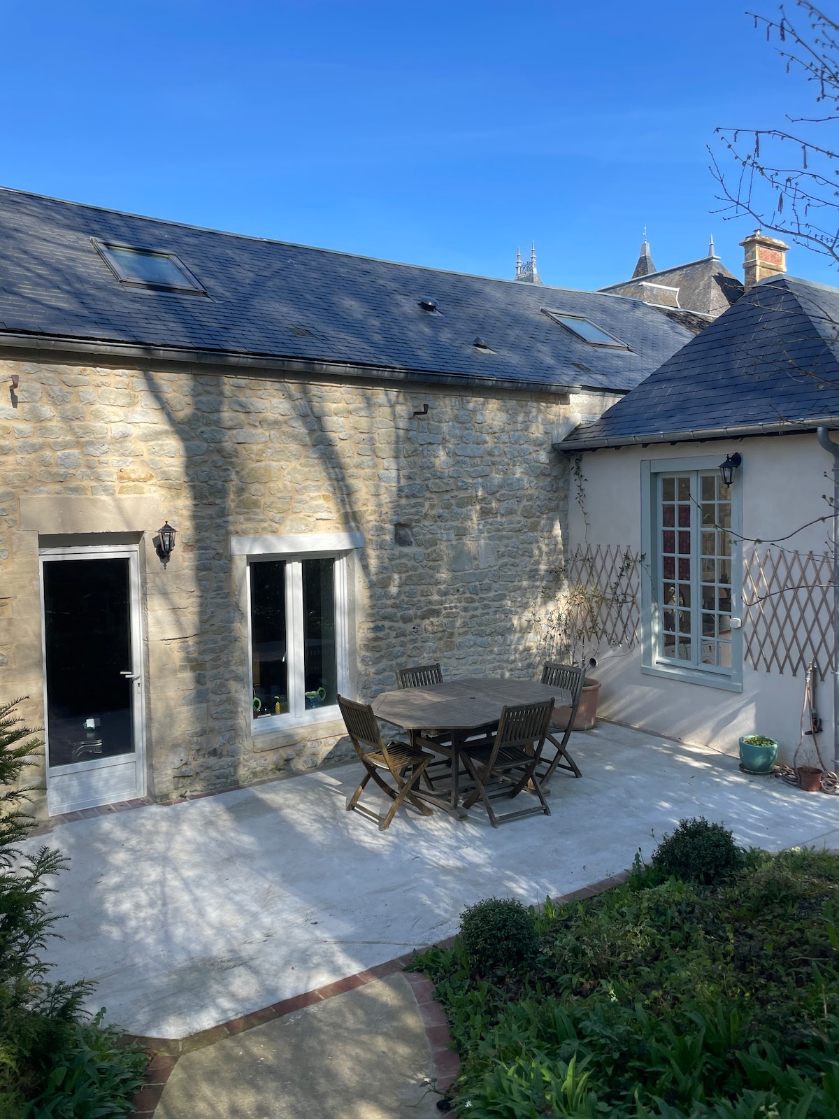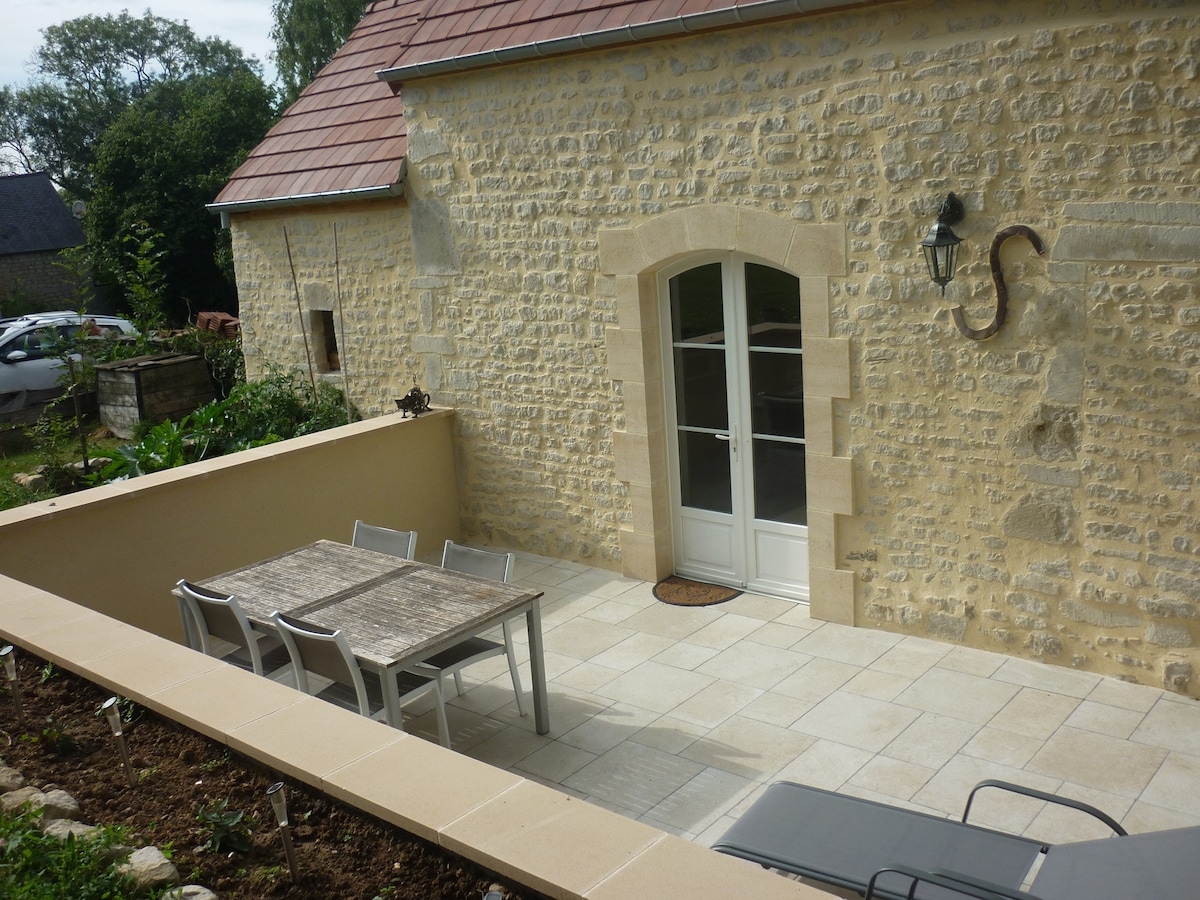 Maison ancienne pleine de charme à la campagne proche des plages du débarquement (6 kms). Tout à côté de Bayeux avec sa célèbre tapisserie (3 km). Jardin privé et clos au soleil toute la journée. A la lisière du village avec épicerie qui fait aussi boulangerie et restaurant. A 20 mns de Caen , ses Abbayes et son Mémorial de la Paix. Accès facile pour le ferry de Ouistreham vers l'Angleterre ou l'aéroport de Carpiquet. 7 mns gare de Bayeux, train direct pour Paris. Meubles vintage et créations.