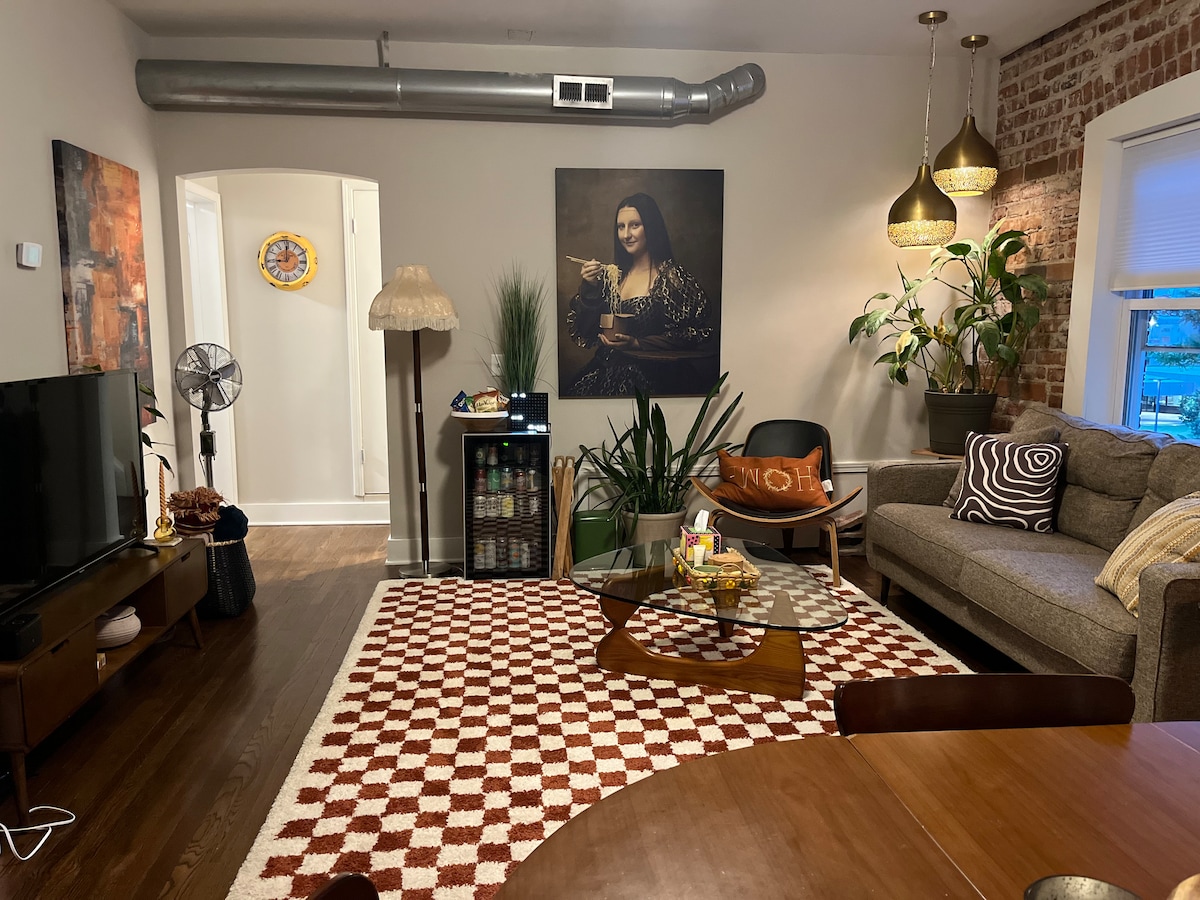 Charming two-bedroom condo in the heart of downtown Omaha. Cozy, comfortable, & fully equipped. Fully stocked kitchen, 2 bedrooms with queen beds, comfortable living room with beverage fridge & cocktail bar. Cozy sunroom with fully supplied coffee bar to sit & enjoy a morning latte or coffee, or turn on the twinkle lights at night & enjoy the view! Just a 5 minute walk from some of Omaha’s best locations: CWS, Gene Leahy Park, and the Old Market! Comes with one free gated parking spot.