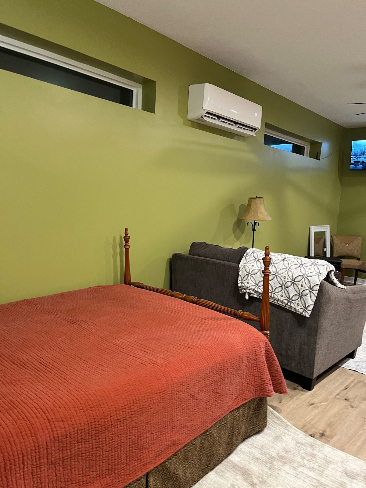 Step into a private and cozy space. Relax watching TV in bed or on the couch. This place is part of our walk out basement, so you may hear day to day living upstairs. For your safety there is a Ring camera installed at the entrance and will light up the entryway when it’s dark. Parking is on the well lit public street. Easily walk up our dedicated Airbnb sidewalk, no steps, walk around to the back of the house. You’ll be in a serene space that makes you feel right at home.