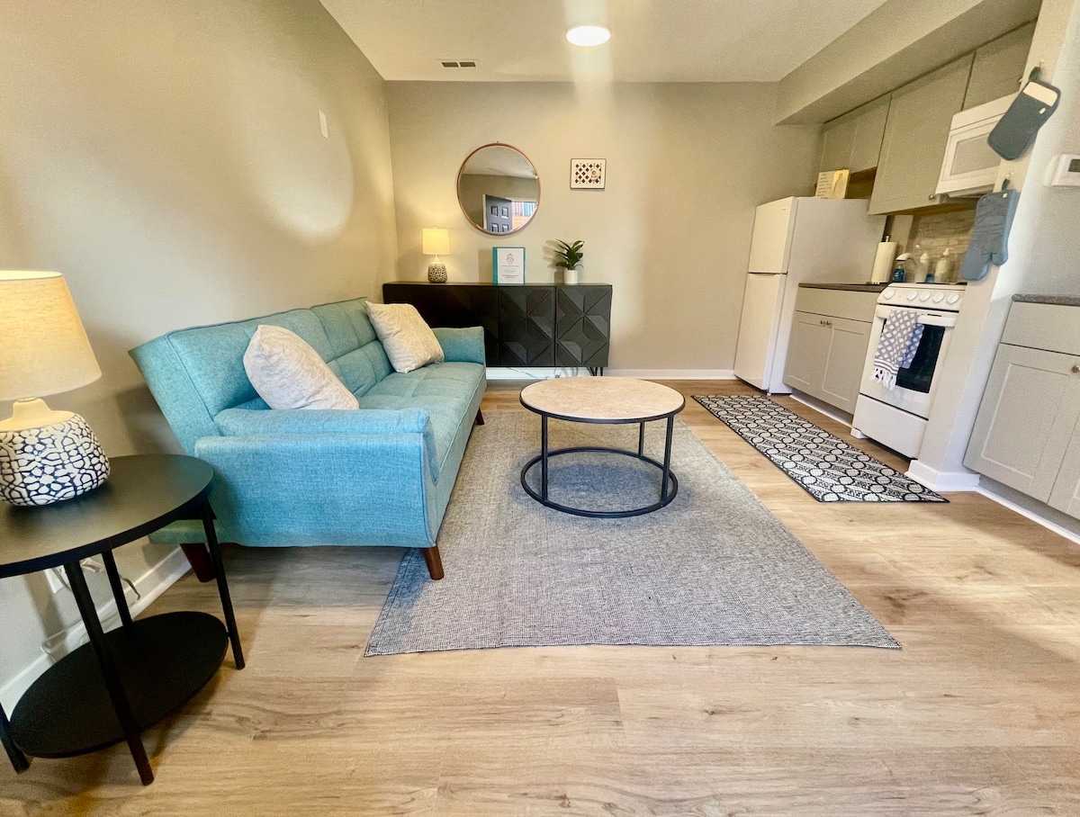 Our Little Boho studio on the top floor of a quiet 4-plex is the ultimate in modern comfort! Every detail is designed with luxury in mind, including a custom kitchen and bath, velvet drapery, and fine finishes. Relax in style with a plush king bed, full-size sleeper sofa, well-equipped kitchen, W/D, patio, and private parking. We are nestled in Little Bohemia, close to downtown, CWS, & the zoo. Enhanced cleaning and self-check-in ensure you're in good hands. Book now for an unforgettable stay!
